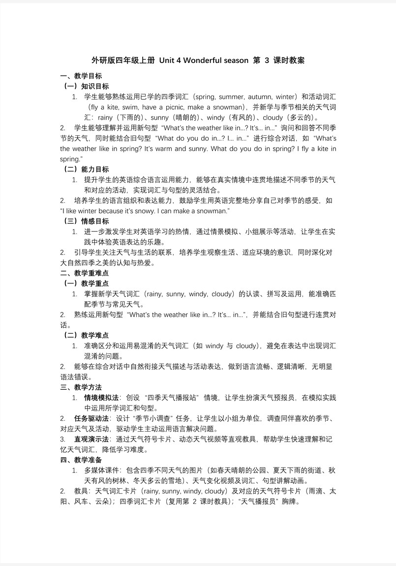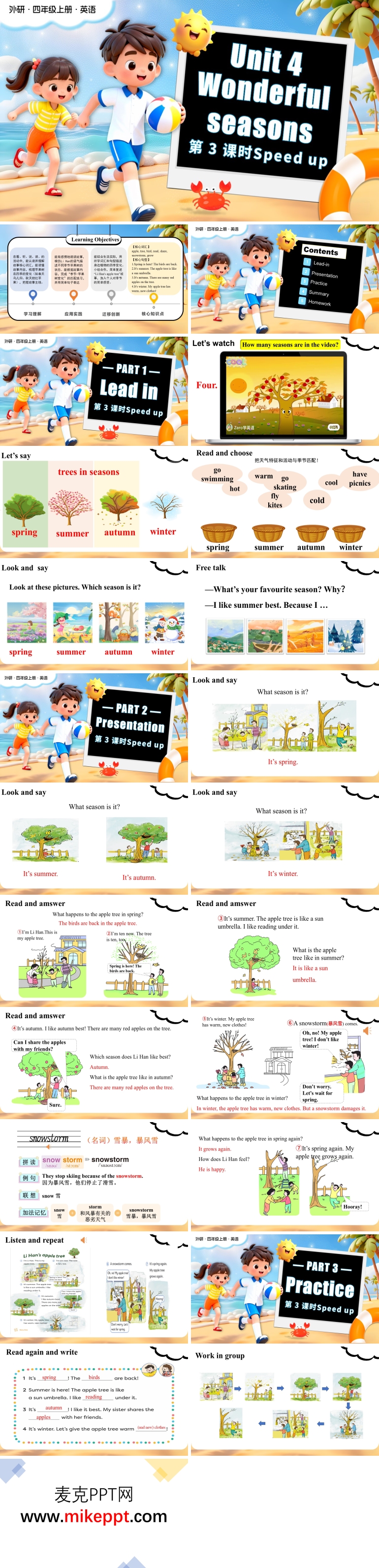 这是一套专为外研版(新教材)英语四年级上册Unit 4 第3课时Speed up设计的PPT课件,共包含28张幻灯片。本节课的核心目标是帮助学生熟练运用之前学过的四季词汇和活动词汇,并在此基础上学习与季节相关的天气词汇。通过情景模拟、小组展示等多样化活动,进一步激发学生对英语学习的热情,让学生在实践中体验英语表达的乐趣,增强语言运用的自信心。 该套PPT从五个方面展开Unit 4 第3课时Speed up的教学内容。第一部分是Lead in(导入)。通过播放与季节相关的视频导入,迅速激活学生的已有知识,降低主题切入的难度。同时,利用对话动画直观呈现核心话题,帮助学生建立“季节变化”的表达认知,为后续学习做好铺垫。 第二部分是Presentation(呈现)。通过图片与词汇的匹配训练,强化学生的“形义对应”认知。这种直观的方式帮助学生更好地理解和记忆新词汇。接着,结合朗读与跟唱活动,纠正学生的发音,提升语音语调的准确性。这一环节不仅巩固了词汇,还通过反复练习帮助学生形成正确的语音习惯。 第三部分是Practice(练习)。通过小组问答的形式创设真实交际场景,引导学生在小组内进行互动交流,实现语言从“模仿”到“运用”的过渡。学生在小组合作中互相学习、互相纠正,不仅提高了语言运用能力,还培养了团队合作精神。此外,通过情景模拟和小组展示,学生能够在实践中体验英语表达的乐趣,进一步激发学习热情。 第四部分是Summary(总结)。这一部分对本节课的重点内容进行回顾和梳理,帮助学生巩固所学词汇和句型,加深记忆。通过总结,学生可以清晰地了解本节课的学习目标和成果,为后续的学习做好准备。 第五部分是Homework(作业)。通过布置有针对性的作业,引导学生在课后继续复习和巩固本节课所学内容。作业设计注重实践性和应用性,旨在帮助学生将课堂所学知识运用到实际情境中,进一步提升学生的英语综合运用能力。 整套PPT的设计注重激发学生的学习兴趣,通过多种教学手段和方法,帮助学生在不同情境中学习和运用词汇及相关句型。课程结构清晰,环环相扣,既注重基础知识的巩固,又注重能力的培养和提升。通过本节课的学习,学生不仅能够熟练掌握四季及相关词汇,还能在实际情境中灵活运用所学知识进行交流,为后续的英语学习奠定坚实基础。