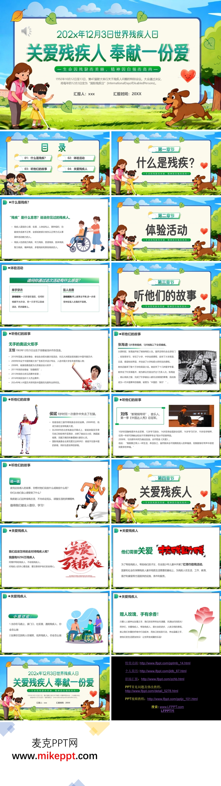 当晨曦照亮每一个生命,我们都应看见那些以不同方式绽放的坚韧光芒。这套题为"2025关爱残疾人,奉献一份爱"的PPT模板,以18张饱含温度的幻灯片,搭建起一座通往理解与共情的桥梁。它不仅仅是一份教学资料,更是一份唤醒社会同理心的温柔倡议——那些因心理或生理功能障碍而面临生活挑战的残疾人,并非需要俯视的弱者,而是与我们平等同行、同样拥有完整人格和尊严的社会成员。一次适时的援手,一句真诚的问候,或许就能为他们推开一扇原本沉重的门,让生活的道路洒满更多阳光。这份精心设计的演示文稿,正是要通过四个环环相扣的篇章,将这份关爱从理念转化为行动。 开篇以"什么是残疾"叩问心灵,它没有停留在冰冷的医学定义,而是邀请每个人回望生活:那个用拐杖丈量街道的叔叔,那个在无声世界里微笑的阿姨,那个眼神清澈却看不清黑板的同学……当具象的面孔与抽象的概念相遇,偏见便开始松动。继而进入"体验活动"环节,这是最触动人心的一章——当健全的手脚被束缚,当明亮的世界被眼罩遮蔽,当喧嚣的声潮骤然寂静,参与者方能真正"走"进残疾人的日常,在笨拙与无措中触摸那份不易,让同情升华为共情,让理解扎根于体验。 第三章"听他们的故事"则将视野投向更辽阔的精神高地。从轮椅上仰望星空的科学家,到用脚趾奏响乐章的钢琴家,这些闪烁着人性光辉的名字,用各自的生命史诗诠释着"残缺"与"圆满"的辩证。他们的存在本身就是一种力量,告诉孩子们:身体的局限从不能定义生命的宽度,真正的强大源于内心的不屈。而压轴篇章"我们应该如何关爱",则将这些震撼与感动沉淀为可落地的善意——或许是公交车上的起身让座,或许是公共场所的无障碍关注,又或许是学业上的一次耐心讲解,它教会孩子们:关爱不是宏大的口号,而是具体而微的持之以恒。 这套PPT如同一粒种子,将在孩子们心田种下尊重与善良的嫩芽,假以时日,终将长成庇佑所有人的大树。