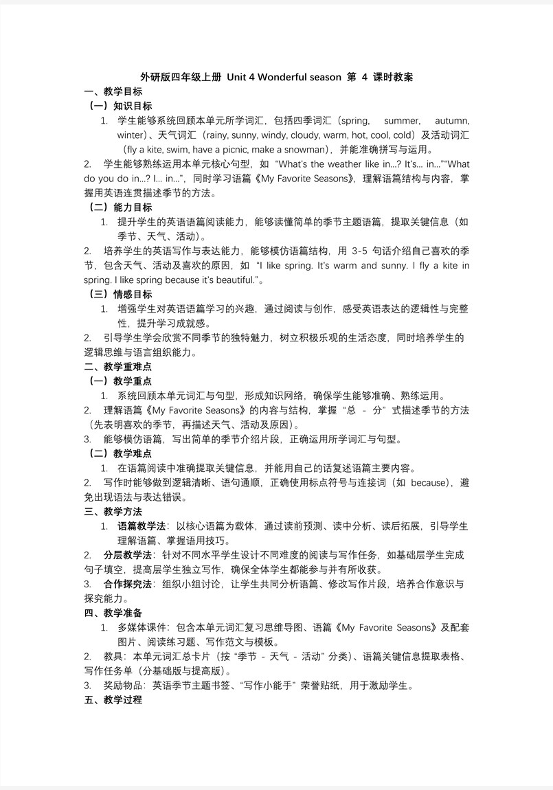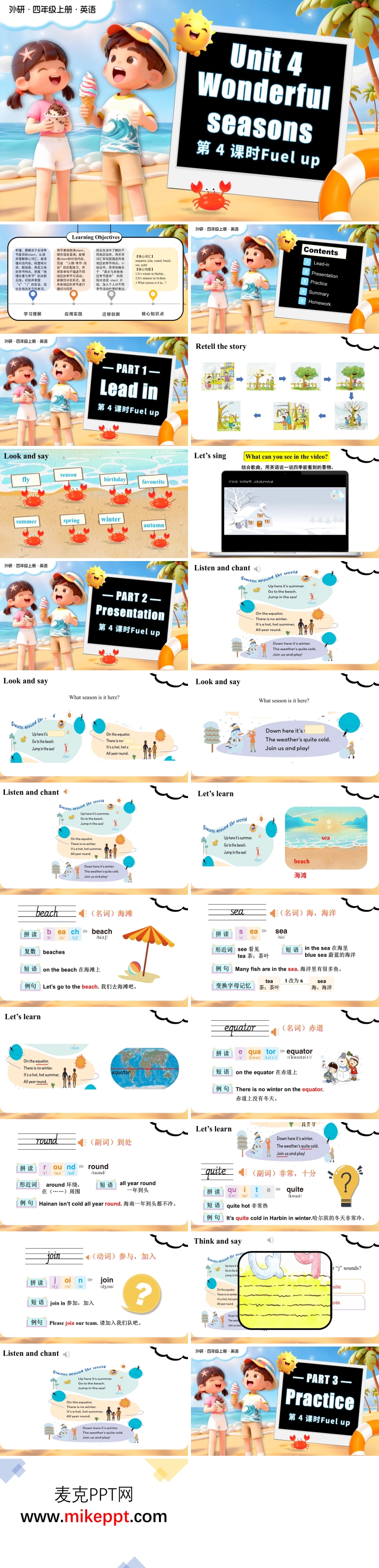 这是一套专为外研版(新教材)英语四年级上册Unit 4 第4课时Fuel up设计的PPT课件,共包含32张幻灯片。本节课旨在通过系统的教学活动,帮助学生进一步巩固和拓展关于四季的知识,提升学生的语言综合运用能力。通过视频导入、听力练习、发音复习、歌谣学唱等多种形式,学生将在轻松愉快的氛围中加深对四季特征的理解,并激发他们对不同地区季节和气候的探索兴趣。 该套PPT从五个方面展开Unit 4 第4课时Fuel up的教学内容。第一部分是Lead in(导入)。通过播放与四季相关的视频,迅速激活学生的已有知识,降低主题切入的难度。同时,利用对话动画直观呈现核心话题,帮助学生直观地看到四季的不同景物,为后续学习做好铺垫。这种生动的导入方式能够有效激发学生的学习兴趣,使他们快速进入学习状态。 第二部分是Presentation(呈现)。通过“listen and chart”(听一听,填一填)的活动,带领学生共同了解大海周围的景色。学生在听的过程中需要记录相关信息,这一环节不仅锻炼了学生的听力能力,还培养了他们的信息提取和整理能力。通过这种方式,学生能够更好地理解不同季节的自然景观特征。 第三部分是Practice(练习)。首先通过听录音,让学生跟读,进一步纠正发音并提升语感。接着,结合图片帮助学生巩固不同季节所对应的景象。这种图文结合的方式能够帮助学生将抽象的语言知识与具体的视觉信息相结合,加深对四季特征的理解和记忆。同时,通过反复练习,学生能够更加熟练地运用所学词汇和句型进行表达。 第四部分是Summary(总结)。这一部分首先帮助学生回顾复习了字母组合“qu”和“j”在单词中的发音。通过发音练习,学生能够进一步巩固语音知识,提高发音准确性。接着,学唱歌谣“Season around the world”,通过音乐和节奏,帮助学生在轻松的氛围中巩固本节课所学内容。歌谣的形式不仅增强了课堂的趣味性,还帮助学生更好地记忆和运用相关词汇和句型。 第五部分是Homework(作业)。这一部分主要是帮助学生及时回顾本节课的所学知识,同时鼓励学生课后搜集更多不同城市的季节和气候信息。这种拓展性作业不仅能够巩固课堂所学,还能激发学生自主学习的积极性,培养他们的信息搜集能力和跨文化意识。 整套PPT的设计注重知识的系统性和趣味性,通过多种教学手段和方法,帮助学生在不同情境中巩固和拓展所学知识。课程结构清晰,环环相扣,既注重基础知识的复习,又注重能力的培养和提升。通过本节课的学习,学生不仅能够进一步掌握四季相关的词汇和句型,还能在实际情境中灵活运用所学知识进行交流,为后续的英语学习奠定坚实基础。