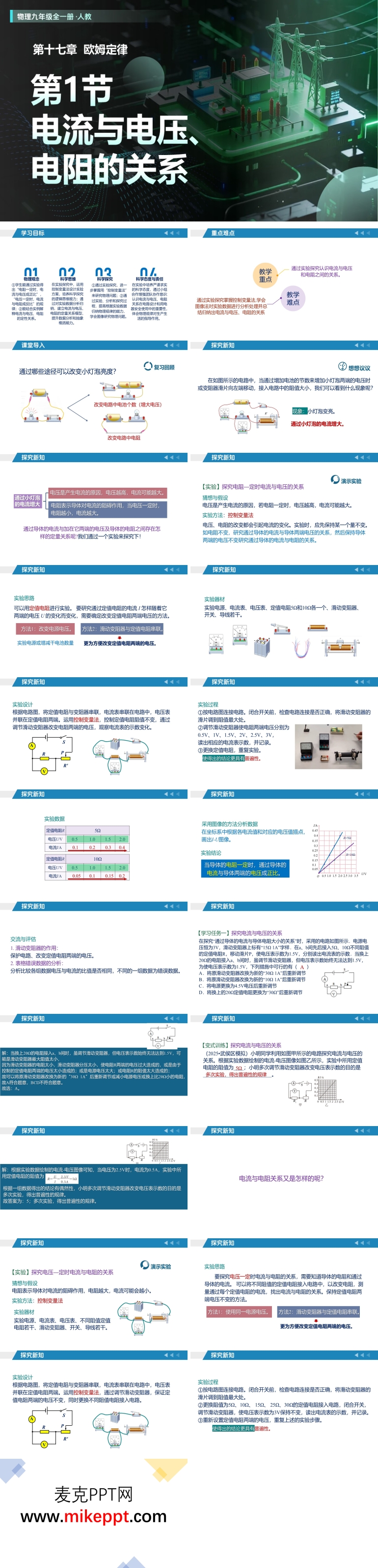 这套教学课件围绕人教版九年级物理全一册第十七章《欧姆定律》的第一节“电流与电压、电阻的关系”展开,共包含39张幻灯片。物理作为一门贴近生活的自然学科,不仅能够揭示日常现象背后的本质,还蕴含着大量经过反复实验验证的规律。欧姆定律便是其中最具代表性的电学基本定律之一,它凝聚了物理学家们长期实验探究的智慧结晶。本课件以循序渐进的方式,将抽象的物理概念具体化、形象化,帮助学生在理解的基础上形成系统的知识结构。 课件开篇通过生活化情境引入,激活学生已有经验,让他们意识到“电压、电流、电阻”并非陌生词汇,而是隐藏在电灯亮度、充电器发热等日常现象中的“幕后推手”。随后,借助交互式动画与实验视频,引导学生经历“提出问题—猜想假设—设计实验—收集数据—分析论证—得出结论”的完整科学探究流程,在动手与动脑相结合的过程中,自主发现“同一导体中,电流与两端电压成正比,与电阻成反比”的定量关系,从而自然生成欧姆定律的表达式。为突破“电阻是导体本身性质,与电压、电流无关”这一思维障碍,课件特别设置了对比实验:更换不同材料、长度、横截面积的电阻丝,观察电流变化,促使学生辨析“数学比例”与“物理因果”的差异,培养批判性思维。 在“物理思维”板块,课件通过动态图像叠加坐标系,将实验数据实时绘制成I-U图像,让学生直观感受“正比例”图线的物理意义,并迁移到“小灯泡电阻随温度变化”的非线性图线,体会物理规律的适用条件与局限性。最后的“科学态度与责任”环节,课件展示了欧姆当年在简陋条件下历经十余年反复实验的史料,配合现代精密仪器测量对比,让学生领悟“尊重数据、严谨求实”的科学精神;同时引入“家庭电路短路引发火灾”的新闻案例,引导学生运用欧姆定律分析事故原因,提出安全用电建议,树立“知识服务社会”的责任意识。整份课件既注重知识生成,又凸显素养立意,为一线教师提供了可借鉴、可拓展的立体化教学方案。