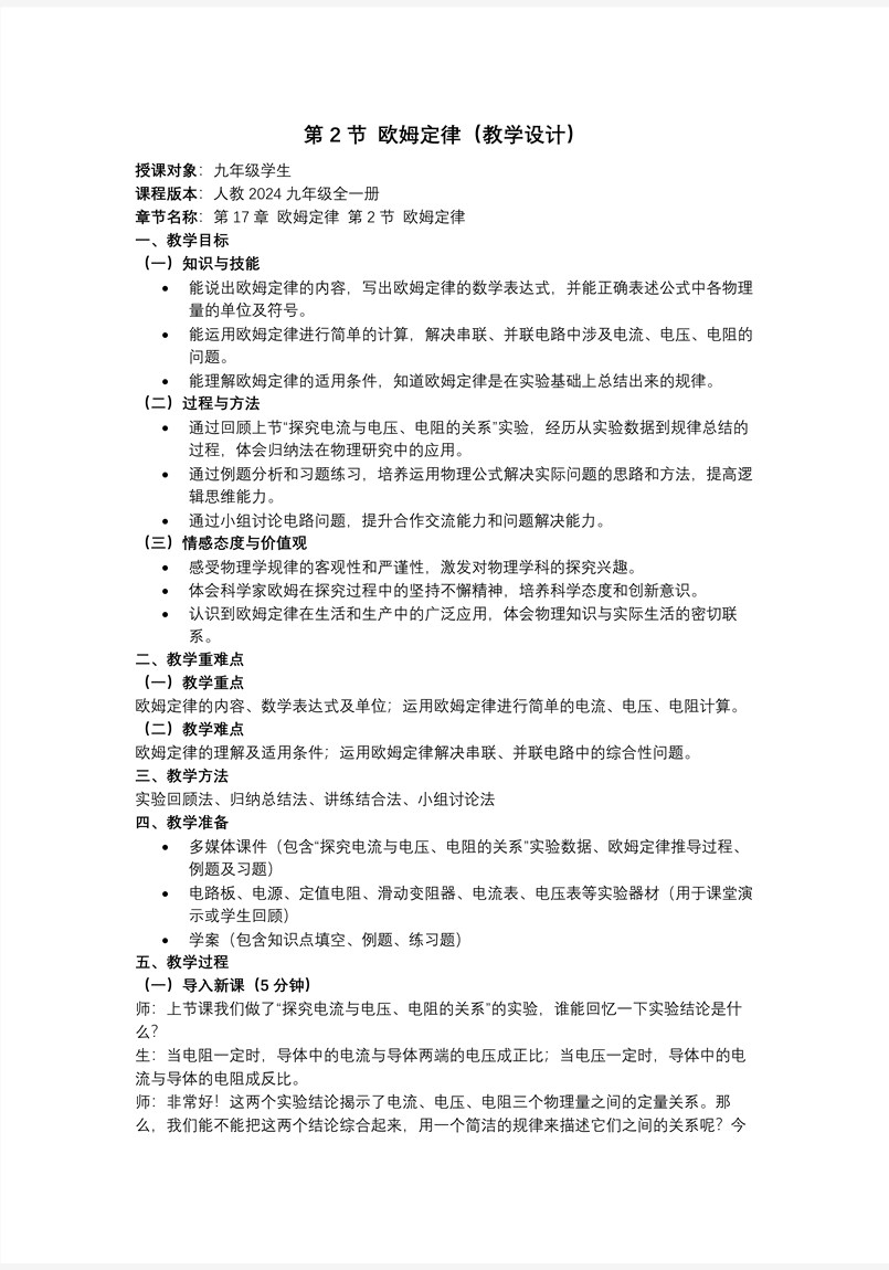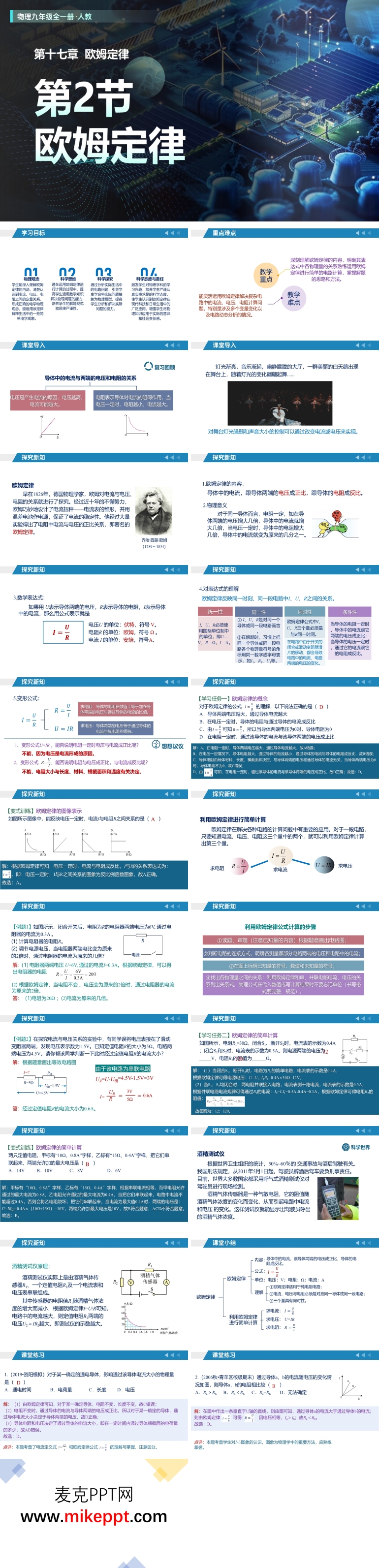 这份专为九年级打造的欧姆定律教学课件共28张幻灯片,以“会解题、会建模、会思考”为线索,把一条看似简单的I=U/R公式拆成四个层层递进的“能力阶梯”。第一阶梯先帮学生“正三观”:用一张家庭配电箱的实拍图抛出“为什么空调插口比照明插口粗”“为什么电热水器会跳闸”等生活疑问,让学生意识到电压、电流、电阻不是课本符号,而是决定电器生死的“幕后三角”。第二阶梯聚焦“严谨用律”:课件给出四道易错例题——“电压表并错位置导致电阻测量值偏大”“滑动变阻器接成定值电阻”等,让学生现场找茬、改接线、重算数据,在纠偏中体会“条件一致性”与“量程匹配”对结果的决定性作用,从而养成“先检查电路,再代公式”的思维习惯。第三阶梯上升到“建模抽象”:把“手机快充变慢”“电动车爬坡掉速”等真实情境拆成“谁变了?谁没变?”两张对比表格,引导学生用“等效电阻”概念把复杂电路简化为串并联模型,再用欧姆定律定量解释现象,完成“生活语言→物理语言→数学语言”的两次翻译。最后一阶梯落脚“科学态度”:课件播放两段对比视频——一段是实验员用普通导线短接蓄电池引发浓烟,另一段是用欧姆定律提前计算安全电流、选择合适保险丝的成功案例,让学生在震撼中明白“算对1安培,可能挽救一条生命”;随后布置课后任务——测量家中路由器、台灯、电吹风的实际电流,与铭牌标称值对比,撰写“安全用电建议书”,把课堂知识转化为家庭责任。整份模板例题鲜活、梯度清晰,既教“算得准”,更教“想得深”,让欧姆定律从纸面公式真正变成学生手中的“安全尺”与“智慧尺”。