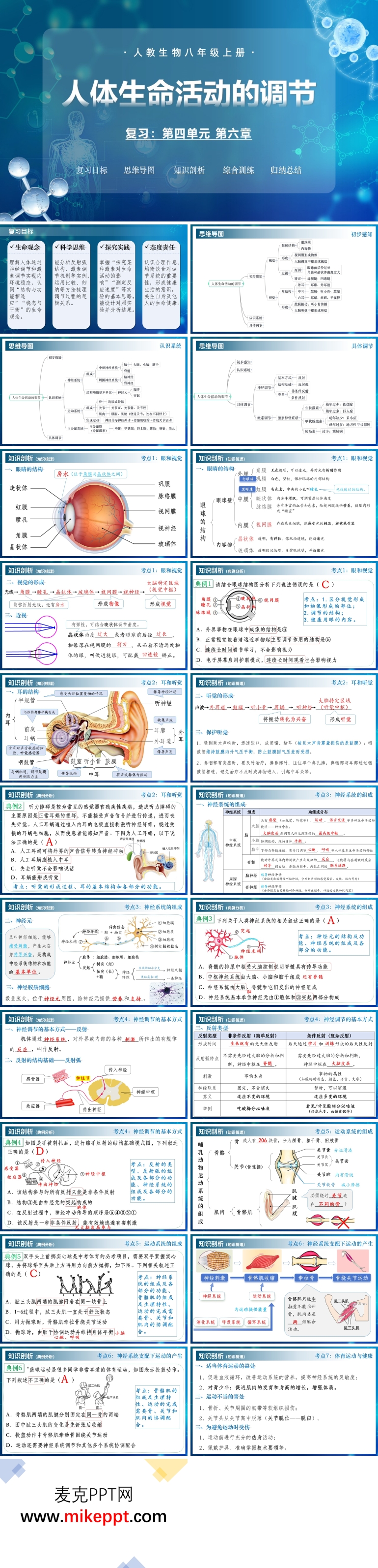 这套36张幻灯片的八年级生物上册同步课件,以“人体生命活动的调节”为核心,将原本分散在神经、内分泌与行为层面的知识整合成一条清晰的“稳态维持”主线。开篇先用一段延时摄影——从清晨跑步到深夜熟睡,心率、呼吸、瞳孔、血糖随环境变化而起伏——让学生直观感受“身体像一台24小时自控的机器”,顺势抛出“谁在发号施令”这一驱动问题。 第一部分“生命观念”用双气泡图对比“神经调节”与“激素调节”:前者快如闪电、定位精准,后者慢而持久、广撒网;再借“考试前心跳加速”这一真实情境,让学生找出两种调节协同的证据,从而建构“稳态=多系统动态平衡”的大概念。 第二部分聚焦“反射弧”与“激素轴”。课件先放一段膝跳反射的慢动作,逐帧定格感受器→传入神经→中枢→传出神经→效应器,随后用AR插件把“反射弧”叠映在学生腿部实时影像上,让抽象路径瞬间“长”在自己身上;紧接着以“血糖平衡”为例,用动态曲线展示胰岛素与胰高血糖素的拮抗过程,让学生体会激素“微量高效”的特点。 第三部分“探究实践”提供三项任务:①设计盲道行走实验,验证条件反射可建立也可消退;②用尿糖试纸检测不同饮料摄入后血糖波动,模拟糖尿病筛查;③记录一周睡眠时段与晨起脉搏,分析作息对自主神经的影响。学生任选其一,课后提交短视频报告,实现“做中学”。 结尾回到“健康生活”:把熬夜、暴饮暴食、长时间戴耳机的危害量化成“稳态负债表”,让学生自己计算“身体多久才能还清”,从而把知识转化为可执行的生活方案——早睡30分钟、每天2000毫升水、一次不超过60分贝的耳机音量。36页幻灯片,既讲清了“生命如何被调节”,更让学生带着“我要主动调节生命”的信念离开教室。