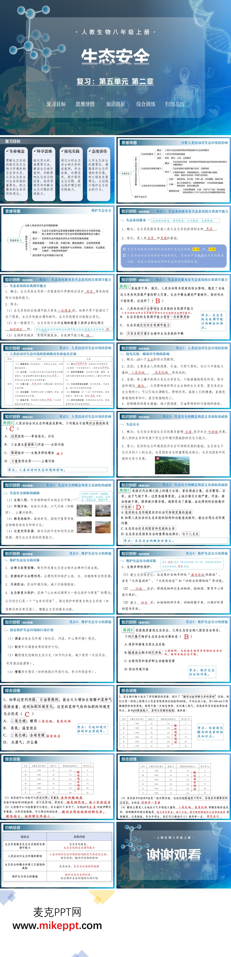 这份仅23页的课件像一张“生态安全警示地图”,用极简篇幅浓缩了八年级生物上册最难“讲清楚”的宏观命题——生态失衡如何反噬人类。开篇3秒倒计时后,屏幕出现一分为二的照片:左侧是1989年碧波荡漾的滇池,右侧是2020年蓝藻暴发的同一视角,像素级对齐的“时空裂谷”让学生瞬间静默,教师顺势抛出核心问题:若生态系统崩溃,谁来为14岁的你们兜底? 第一部分把“生态安全”定义为“地球生命支持系统的保险丝”。课件用动态漏斗图演示:大气净化、水源涵养、土壤形成、授粉服务等12项关键功能如同并联的“隐形器官”,一旦某一环断裂,人类社会的粮食、健康、经济将像多米诺骨牌接连倒塌。学生拖动滑块模拟“砍伐强度10%→50%”,后台实时反馈“氧气产量”“碳储量”“物种数”三条曲线,直观感受临界点前的“温水煮青蛙”。 第二部分呈现“生态破坏史诗级案例”:①亚马逊连续两年释放碳大于吸收,雨林正变“草原”;②塑料微粒在马里亚纳海沟检出;③国内某湿地消失导致候鸟改道,引发飞机鸟击事件激增。每条案例都配一张“人类看似无关”的对比图——超市牛排、外卖餐盒、机场航班,让学生意识到:破坏的扳机可能握在每一次消费选择里。 第三部分升级为“生态安全探究任务”:班级领取“校园生态足迹”项目,用三周时间测量食堂剩饭、快递纸箱、空调耗电,数据导入课件内置的“行星边界”模型,生成专属“超载红灯”报告。学生惊讶发现:按当前速度,需要1.7个地球才能承载他们的生活方式,于是自发提出“无塑星期三”“27℃空调日”等减量方案。 收篇页只有一句话:“生态没有替代品,人类也没有备份星球。”背景是逐渐暗淡的地球灯。23张幻灯片,短得刚好够一节班会,却长得足以在少年心里亮起一盏长明警示灯——生态安全,其实就是人类未来的安全。