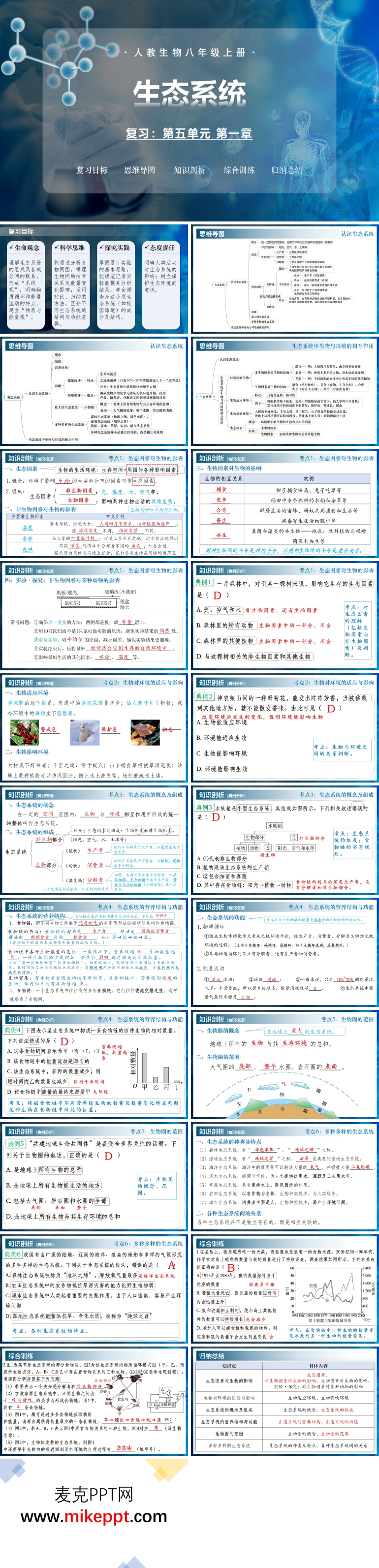 这套24页的PPT承接“生态安全”警示,顺势把镜头拉回源头——生态系统本身,带领八年级学生拆解“生命共同体”的精密构造与运行逻辑。课件以一张航拍珠江口湿地的晨雾开镜:红树林、滩涂、候鸟、渔船同框,提问“谁依赖谁?”瞬间激活上节课的危机记忆,为“系统”概念埋下伏笔。 第一部分聚焦“生态因素”。先让学生起立扮演“一株红树”,屏幕随机弹出盐度、潮汐、温度、光照等数值,身体根据提示“前倾”“后仰”模拟生长受限或旺盛,三分钟体验即把“非生物因素”刻进肌肉记忆;再插播慢镜头:螃蟹剪断幼苗、白鹭啄食小鱼,生物因素间的捕食、竞争、共生关系瞬间立体。 第二部分翻转视角——“生物也改造环境”。播放澳洲兔群引入后土表荒漠化的延时影像,对比珊瑚虫用碳酸钙“砌”出大堡礁的正向案例,学生分组用“+”“-”号贴图归纳“生物是环境工程师”的双刃剑效应,自然生成“协同进化”观念。 第三部分正式抛出生态系统定义:一定空间内生物+环境通过能量流动、物质循环形成的统一整体。动态图把“生产者→初级消费者→次级消费者→分解者”连成闭环,阳光、二氧化碳、氧气、养分随箭头实时流转,学生眼见得“垃圾其实是放错位置的资源”,理解为何说“没有分解者就没有地球重启键”。 第四部分用“生态系统盲盒”游戏收官:雨林、草原、极地、深海热泉、校园花坛五张GIF轮播,学生凭能量来源、物种丰富度、人类干扰度快速抢答归类,最后教师亮出“人工湿地净化污水”项目,邀请班级认领监测任务,把课堂知识延伸为真实生态服务。24张幻灯片,短促却完整呈现了“因素—适应—系统—多样性”的知识链,更在少年心里种下“了解系统,才能修复系统”的生态责任感。