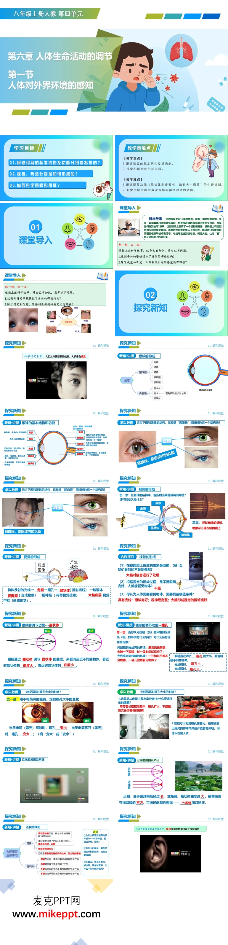 这套与八年级生物上册“4.6.1 人体对外界环境的感知”配套的演示文稿共36张幻灯片,整体设计层层递进,力求让课堂既严谨又生动。整堂课结束后,学生收获的不仅是课本上“眼球由哪几部分组成”这一知识点的简单记忆,而是能够像小医生一样,指着眼球模型准确说出角膜、晶状体、视网膜等结构的名称与功能;面对“为什么长时间玩手机会眼花”“为什么从亮处走进暗室一开始什么也看不清”这些日常现象,他们能迅速调动课堂所学,用“瞳孔大小调节”“晶状体曲度变化”等科学语言作出解释,真正实现知识从书本到生活的迁移。为了达成这一目标,课件被精心拆成四大板块:第一板块“情境导入”先抛出一则科学家因眼疾而发现视觉奥秘的短故事,迅速抓住学生注意力,再让他们回忆“眼睛为什么能看到东西”这一旧知,产生认知冲突,主动带着问题走进新课。第二板块“探究新知”是核心环节,教师先利用3D动画分层展示眼球壁和内容物,让学生“走进眼球内部”漫游一圈,随后分组观察实体模型,亲手拆装角膜、晶状体、玻璃体等零件,把抽象名词变成可触可感的“小零件”;接着用flash动态演示光线如何经过折射在视网膜上成像,信息又如何沿视神经一路“快递”到大脑视觉中枢,最终形成“看见”的过程,学生看完动画后能自己画流程图,把视觉形成路径说得明明白白;在此基础上,课件横向拓展到听觉的形成,用同样的“结构—功能—形成路径”思路带领学生拆解耳朵,比较眼睛与耳朵的异同,最后师生共同归纳出“少揉眼、控时间、远屏幕、常眺望”的爱眼口诀和“避噪音、不挖耳、戴耳罩”的护耳锦囊,把科学道理转化为可执行的生活习惯。第三板块“课堂总结”用思维导图把“眼球结构、视觉形成、护眼措施”三大关键词串联起来,让学生一分钟内就能把整节课要点过一遍;紧随其后的“闯关练习”设置四道梯度题——从“选图标注”到“现象解释”再到“生活建议”,即时反馈学习效果。第四板块“课后作业”则布置两项任务:一是让学生回家给家长做一遍“视力检测+护眼知识宣讲”,把课堂所学搬回家;二是完成一份“爱眼手抄报”,用图文形式巩固知识、辐射他人。整堂课通过故事、模型、动画、生活实例的多重刺激,既培养了学生的观察与推理能力,也在他们心里种下了“珍爱光明、科学护眼”的种子,真正实现了知识、能力、情感的三维目标。