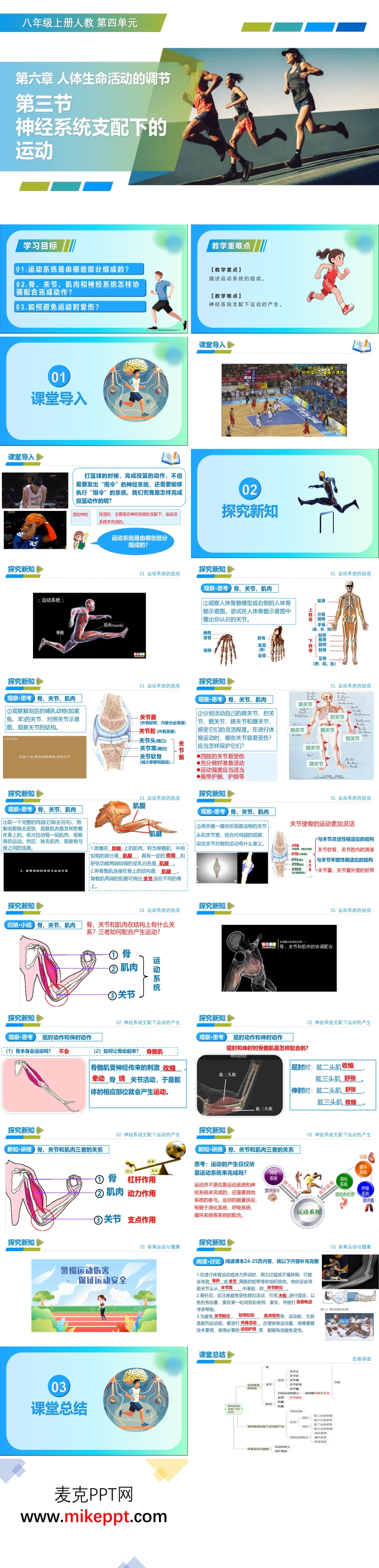 这套专为八年级生物上册“4.6.3 神经系统支配下的运动”设计的28页PPT,以“视频激趣—模型观察—实验探究—生活回归”四步曲为主线,将“神经—运动”这一抽象主题转化为学生看得见、摸得着、悟得深的生动体验。一开场的“课堂导入”摒弃冗长叙述,直接播放一段仅40秒的“扣篮慢动作”:运动员起跳、屈肘、伸展、扣腕,镜头定格关键瞬间,教师追问“谁发出指令?谁拉动骨骼?能量如何精准到位?”三连问瞬间点燃求知火花,学生带着问题走进后续探究。第二部分“探究新知”先亮出3D全息图,学生旋转观察“骨—关节—肌肉”微缩模型,亲手拉动橡皮筋模拟肱二头肌、肱三头肌的拮抗收缩,感受“肌肉收缩牵拉骨骼绕关节转动”的力学本质;随后分组完成“屈肘—伸肘”实验:一人做动作,一人触摸肌肉硬度变化,一人实时记录,再借助手机慢放对比,学生自然得出“神经系统→肌肉→骨骼→运动”的因果链,真正理解“人体是一个在神经统帅下精密协作的统一整体”。第三板块“课堂总结”用一张可交互思维导图把“中枢指令—神经传导—肌肉收缩—骨骼运动—能量供应”五大节点串联,学生上台拖拽关键词,系统瞬间给出对错反馈,30秒完成知识再建构;紧随其后呈现“久坐伤肌、久视伤神”两张对比图,引导学生把刚学到的“协调统一”观念迁移到健康生活,自觉树立“每天锻炼30分钟,让神经与肌肉同步升级”的意识。最后的“课堂练习”采用“闯关升级”模式:基础关单选快速扫描概念易错点;提升关给出“踢球射门”情境,让学生用“反射弧五环节”语言描述从看到球到起脚射门的完整路径;拓展关则开放提问“为何长期不运动肌肉会萎缩”,鼓励学生结合神经支配与肌肉代谢双重角度作答,答案上传Pad即时生成云词频,教师现场点评,实现教学评一体化。整堂课通过“视频冲击—模型拆解—实验验证—导图梳理—生活警示—闯关评价”六大环节,层层递进,不仅让学生轻松掌握“神经系统如何精准指挥运动”的核心知识,更在潜移默化中培育了结构功能观、稳态与平衡观、健康生活观等多重生物学素养,真正把“知之者”升华为“好之者”“乐之者”。