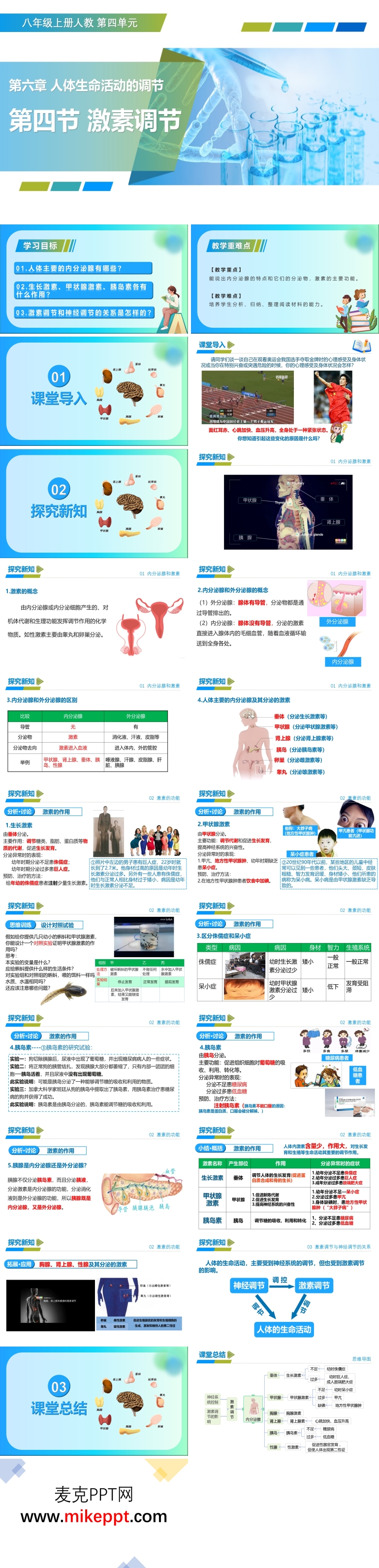 这套配合八年级生物上册“4.6.4 激素调节”的29页演示文稿,以“奥运赛场的极限瞬间”切入,用“情境—探究—建模—应用”四环递进,让学生在热血沸腾的视频中感受激素的“隐形指挥”,在资料分析与案例会诊中完成知识、能力与情感的三维跃升。课堂伊始,教师播放12秒短片:苏炳添9秒83冲刺后大汗淋漓、心跳如鼓,镜头定格在挥汗瞬间,教师顺势追问“是谁让他瞬间爆发?又是什么让他很快恢复?”问题一出,学生立刻被拉进“激素世界”。第二板块“探究新知”先抛出“内分泌腺—外分泌腺”实物对比:唾液腺带导管、胰腺既外又内,学生用放大镜观察显微切片,完成“有无导管”分类游戏,顺势得出“激素=无导管+直接入血”的核心概念;随后三组分别领取“生长激素、甲状腺激素、胰岛素”资料包,阅读折线图、X光片、化验单,扮演“小内分泌科医师”给“侏儒症”“呆小症”“糖尿病”三位虚拟患者下诊断、开处方,并上台用磁贴把“腺体—激素—靶器官—症状”拼成思维链,在合作与碰撞中深刻体会“微量激素,千里传令”的威力。第三板块“课堂总结”用一张“激素—神经双调节”跷跷板动画,让学生拖动“血糖升高”“受到惊吓”等情境标签,直观感受“谁主沉浮”,并得出“神经快速精准、激素缓慢持久”的互补关系;教师再补充“熬夜—皮质醇升高—免疫力下降”的生活实例,引导学生把知识迁回自身,自觉养成“早睡、均衡、运动”的健康习惯。最后的“课堂练习”采用“奥运知识闯关”:基础关单选快速扫描“腺体位置”;提升关给出“甲亢运动员能否参赛”情境,让学生结合甲状腺激素功能作出判断;拓展关则开放提问“如何科学预防青春期‘身高焦虑’”,答案上传云端生成词云,教师现场点评,实现教学评一体化。整堂课通过“视频激趣—资料会诊—模型建构—生活回归—闯关评价”五大环节,不仅让学生轻松掌握“人体主要内分泌腺及其激素功能”的核心考点,更在潜移默化中培育了信息处理、合作探究、知识迁移等多重素养,真正把“冷冰冰的激素”升华为“热乎乎的生活守护”,使学生深刻体会到生物学与健康的紧密相连,从而点燃持续探索生命奥秘的热情。