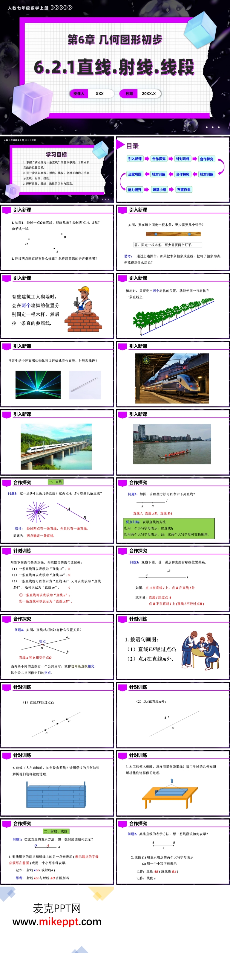 本套PPT课件围绕人教版数学七年级上册6.2.1《直线、射线、线段》展开,共包含36张幻灯片。其核心目标是引导学生深入理解直线、射线、线段的定义,清晰地辨析三者之间的区别与联系,掌握直线的基本性质,并能够运用这些性质解决简单的实际问题。此外,通过本节课的学习,旨在培养学生的抽象思维能力和数学建模能力,为后续的数学学习奠定坚实基础。 PPT内容从七个方面展开。第一部分是引入新课,通过画图、工人砌墙等实际问题,引导学生观察生活中的直线现象,唤起学生对直线已有的认知,从而自然地引出本节课的学习主题。第二部分是合作探究,让学生通过动手操作、小组讨论等方式,共同探究直线、射线、线段的定义,并学会用图形符号表示它们,同时掌握三者的区别与联系。第三部分是针对训练,通过一系列精心设计的练习题,帮助学生巩固对知识点的理解和运用,强化学习效果。第四部分是当堂巩固,进一步加深学生对本节课知识的掌握。第五部分是能力提升,通过一些拓展性问题,激发学生的思维潜能,提升学生分析和解决问题的能力。第六部分是课堂小结,引导学生回顾本节课的重点内容,梳理知识体系,加深记忆。第七部分是布置作业,通过课后作业巩固课堂所学,同时为下一节课的学习做好铺垫。 整套PPT课件设计科学合理,内容丰富,形式多样,能够充分调动学生的学习积极性,帮助学生更好地理解和掌握直线、射线、线段的相关知识,是一套非常实用的教学资源。