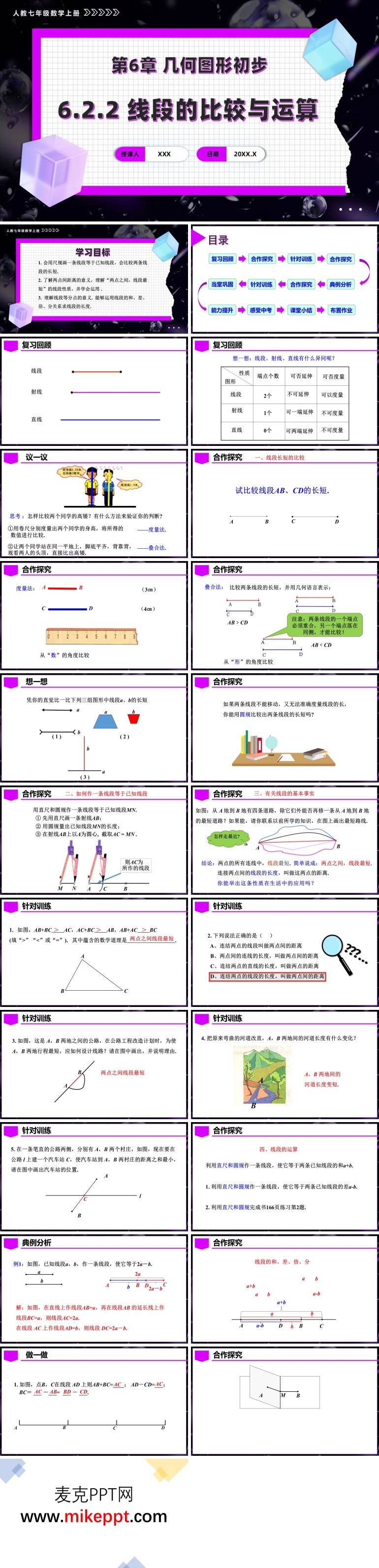 本套PPT课件是针对人教版数学七年级上册6.2.2《线段的比较与运算》设计的教学资源,共包含42张幻灯片。课程的核心目标是帮助学生掌握线段比较的两种基本方法——叠合法和度量法。通过类比生活中比较物体长短的方法,引导学生从具体情境出发,逐步过渡到抽象的数学概念,从而探究线段比较的方法。这一过程不仅有助于学生理解线段比较的原理,还能有效培养学生的抽象思维能力和类比推理能力。 PPT课件从九个方面展开教学内容。第一部分是复习回顾,通过梳理线段、射线、直线三者的区别,帮助学生巩固基础知识,同时自然引出本节课的学习主题——线段的比较与运算。第二部分是合作探究,通过提出“如何比较两个同学的高矮”这一贴近生活的问题,激发学生的思考,鼓励他们自由探究比较长短的方法。这种探究式学习方式能够让学生在实践中体会比较线段长短的基本思路。 第三部分是针对训练,通过一系列有针对性的练习题,帮助学生巩固线段比较的方法。第四部分是典例分析,通过详细讲解具体例题,引导学生逐步建立解题思路,掌握线段比较与运算的技巧。第五部分是当堂巩固,通过课堂练习进一步加深学生对知识的理解和记忆。第六部分是能力提升,通过更具挑战性的题目,拓展学生的思维,提升学生解决复杂问题的能力。 第七部分是感受中考,通过引入中考真题或类似题目,让学生提前感受中考的题型和难度,增强学生对知识的综合运用能力。第八部分是课堂小结,引导学生回顾本节课的重点内容,梳理知识体系,帮助学生巩固所学知识。第九部分是布置作业,通过课后作业巩固课堂所学,同时为学生提供进一步思考和探索的空间。 整套PPT课件设计科学合理,内容丰富,形式多样,能够充分调动学生的学习积极性,帮助学生更好地理解和掌握线段的比较与运算的相关知识,是一套非常实用的教学资源。