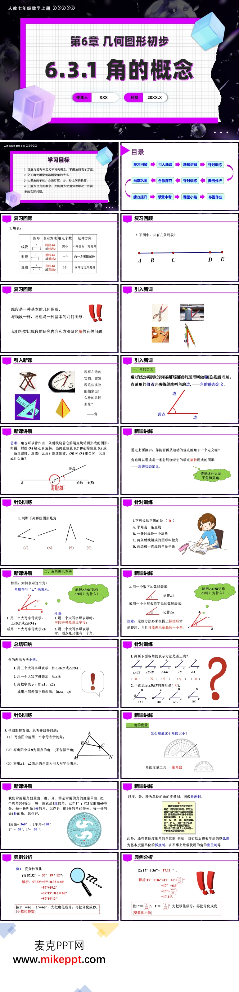 本套PPT课件是针对人教版数学七年级上册6.3.1《角的概念》设计的教学资源,共包含45张幻灯片。课程的核心目标是帮助学生全面掌握角的两种定义,明确角的组成要素,并熟练掌握角的四种表示方法。通过观察生活中的角,引导学生经历从具体实物中抽象出角的几何图形的过程,从而培养学生的抽象思维能力和数学建模能力。 PPT课件从十一个方面展开教学内容。第一部分是复习回顾,通过梳理上节课的知识点,帮助学生巩固基础,为新知识的学习做好铺垫。第二部分是引入新课,通过展示生活中的图片,如钟表的指针、剪刀的张开等,引出本节课的学习主题——角的概念。这种贴近生活的引入方式能够激发学生的学习兴趣,使学生感受到数学与生活的紧密联系。 第三部分是新知讲解,通过动态演示,帮助学生理解角的动态定义,即角是由一条射线绕着端点旋转形成的图形。同时,借助量角器,引导学生掌握如何测量角的大小,为后续的学习奠定基础。第四部分是针对训练,通过一系列基础练习题,帮助学生巩固新学的知识点,加深对角的定义和表示方法的理解。 第五部分是典例分析,通过讲解具体的例题,引导学生逐步建立解题思路,掌握角的表示方法和度量技巧。第六部分是合作探究,通过小组讨论和探究活动,鼓励学生自主发现角的性质和特点,培养学生的合作能力和探究精神。第七部分是当堂巩固,通过课堂练习,进一步加深学生对知识的理解和记忆,确保学生能够熟练掌握本节课的重点内容。 第八部分是能力提升,通过更具挑战性的题目,拓展学生的思维,提升学生解决复杂问题的能力。第九部分是感受中考,通过引入中考真题或类似题目,让学生提前感受中考的题型和难度,增强学生对知识的综合运用能力。第十部分是课堂小结,通过思维导图的方式,帮助学生梳理角的定义、角的表示方法以及角的度量的相关知识,使学生对本节课的内容有更清晰的认识。 第十一部分是布置作业,通过课后作业巩固课堂所学,同时为学生提供进一步思考和探索的空间,帮助学生更好地消化和吸收本节课的知识。 整套PPT课件设计科学合理,内容丰富,形式多样,能够充分调动学生的学习积极性,帮助学生更好地理解和掌握角的概念。通过从具体到抽象的教学设计,学生不仅能够掌握知识,还能培养数学思维和解决问题的能力,是一套非常实用的教学资源。
