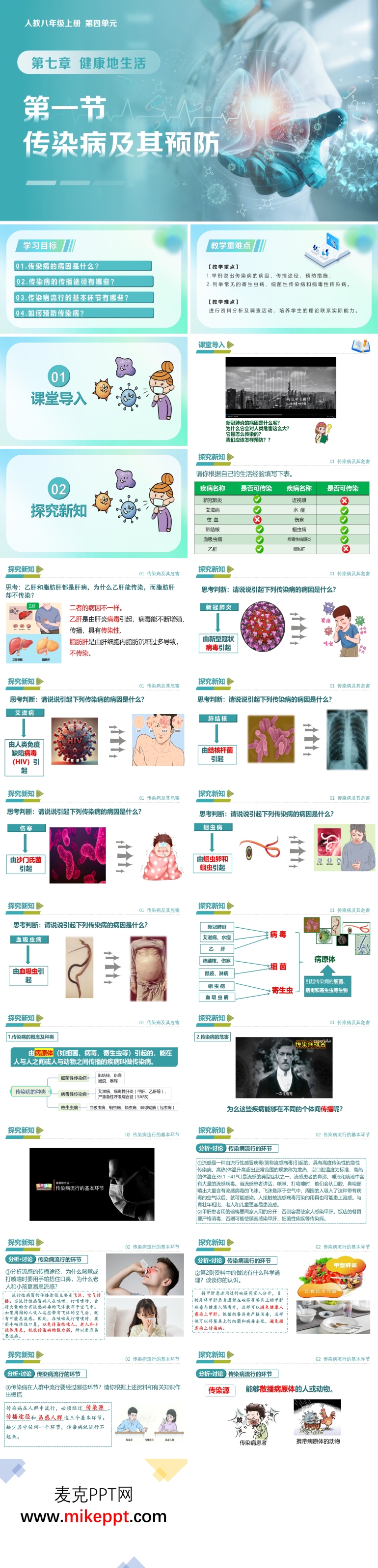 这套专为八年级生物上册“4.7.1 传染病及其预防”设计的演示文稿共 43 张幻灯片,它像一张层层展开的“健康地图”,带领学生从“谈病色变”走向“科学防控”。整堂课以“一条主线、三个维度、四项活动”贯穿始终:主线是“认识—分析—预防”,维度是“知识—能力—责任”,活动则对应“情境导入—合作探究—归纳提升—迁移应用”。 在“情境导入”板块,教师先播放一段只有 30 秒却冲击力十足的新闻短视频:机场检疫人员发现一名发热乘客,瞬间激活学生的好奇心——“为什么一个人能让整架飞机紧张?”由此自然抛出“什么是传染病”这一核心问题。 进入“合作探究”环节,学生借助导学单上的“疫情卡片”分组扮演“疾病侦探”。他们先给卡片上的流感、肺结核、甲肝、艾滋病等病例找“元凶”,在资料包中比对细菌、病毒、寄生虫等病原体图片,从而自己总结出“传染病是由病原体引起、能够在人与人之间或动物与人之间传播的疾病”。随后,教师再引导学生用“三色箭头”黏贴在黑板上:红色箭头指向“传染源”,黄色箭头标出“传播途径”,蓝色箭头锁定“易感人群”,现场生成一幅动态“流行链”示意图,让“三个基本环节”一目了然。 “归纳提升”阶段,课堂突然安静,学生闭眼 10 秒想象:如果自己是卫生部门官员,会从哪里下手拆断这条流行链?睁眼后,他们纷纷在即时贴上写下“隔离患者”“戴口罩”“接种疫苗”等措施,并贴到黑板对应位置,教师顺势梳理出“控源—切径—护人”三级预防策略,强调这与“消灭敌人、切断补给、加固堡垒”异曲同工。 最后的“迁移应用”以“校园防疫提案”收束:每组领取一张空白 A3 海报,用漫画形式设计“班级防疫守则”,下课后张贴在走廊,真正让知识走出教室、走进生活。通过这堂课,学生不仅知道了传染病的概念、特点与分类,更在“侦探—指挥官—宣传员”的角色体验中,把“保护自己、关爱他人”的健康理念内化为日常习惯:勤洗手、常通风、合理作息、均衡膳食,用科学武器为自己和他人的健康筑起一道看不见的“免疫长城”。