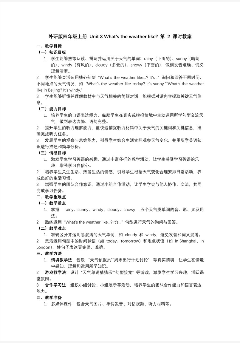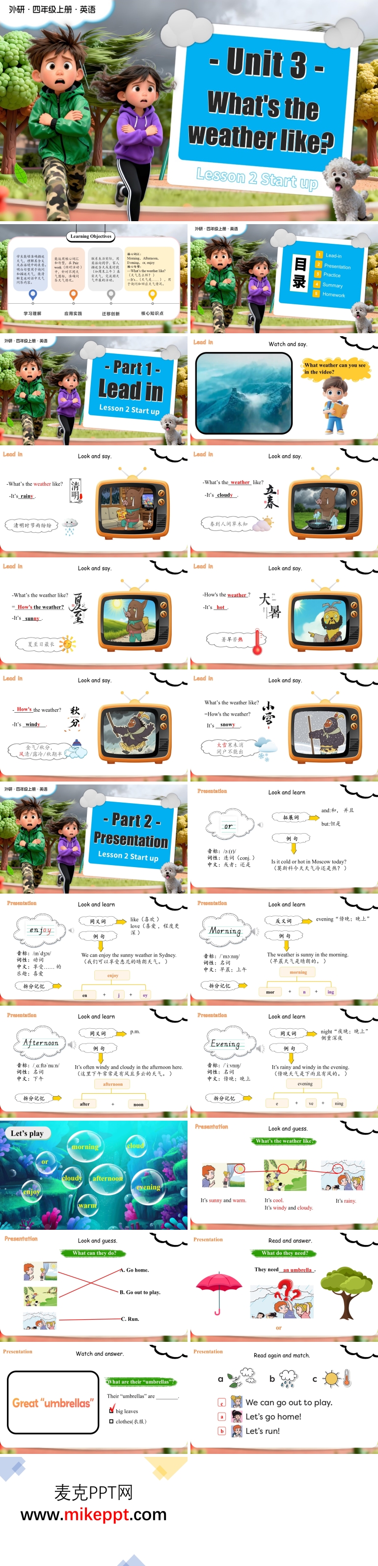 本套PPT课件是为外研(新教材)英语四年级上册Unit 3第2课时Start up设计的教学资源,共包含46张幻灯片。课程的主要目标是帮助学生熟练掌握并运用与天气相关的单词及核心句型,通过真实或模拟的情境教学,提升学生的口语表达能力,同时培养学生的语言运用能力和合作意识。 PPT课件从五个方面展开教学内容。第一部分是Lead in(导入)。这一部分通过播放视频和展示图片,创设直观的天气情境,激发学生的学习兴趣。同时,借助相关问题引导学生初步感知语言素材,为后续学习做好铺垫。这种生动的导入方式能够迅速吸引学生的注意力,帮助他们自然地进入学习状态。 第二部分是Presentation(呈现)。这一部分通过让学生观察图片并回答与天气相关的问题,检验学生对天气词汇及核心句型的掌握与运用能力。通过这种方式,教师可以及时了解学生的学习情况,并进一步巩固学生对天气主题语言知识的理解。这一环节的设计注重学生的主动参与,通过互动问答的形式,帮助学生更好地掌握重点内容。 第三部分是Practice(练习)。这一部分通过双人合作的形式,让学生在真实的情境中运用所学语言。学生需要与同伴合作完成任务,如描述天气、进行对话等。这种合作学习的方式不仅巩固了天气相关的语言知识,还培养了学生的合作意识与沟通能力。通过真实情境的模拟,学生能够更好地将所学知识应用于实际交流中,提升口语表达能力。 第四部分是Summary(总结)。这一部分通过回顾本节课的重点内容,帮助学生梳理所学知识,加深记忆。教师可以引导学生总结天气词汇和核心句型,同时鼓励学生分享在课堂中的学习体会和收获。通过总结,学生能够更清晰地认识到自己的学习成果,增强学习的自信心。 第五部分是Homework(作业)。这一部分通过布置课后作业,帮助学生巩固课堂所学内容。作业可以包括书写天气单词、制作天气小报告或与家人进行天气对话等,旨在让学生在课后继续练习和运用所学知识,进一步提升语言能力。 整套PPT课件设计科学合理,内容丰富,形式多样,能够充分调动学生的学习积极性。通过导入、呈现、练习、总结和作业五个环节的有机结合,学生不仅能够掌握天气相关的词汇和句型,还能在真实情境中提升口语表达能力和合作意识。这是一套非常实用且有效的教学资源,能够帮助教师高效完成教学任务,同时促进学生的全面发展。