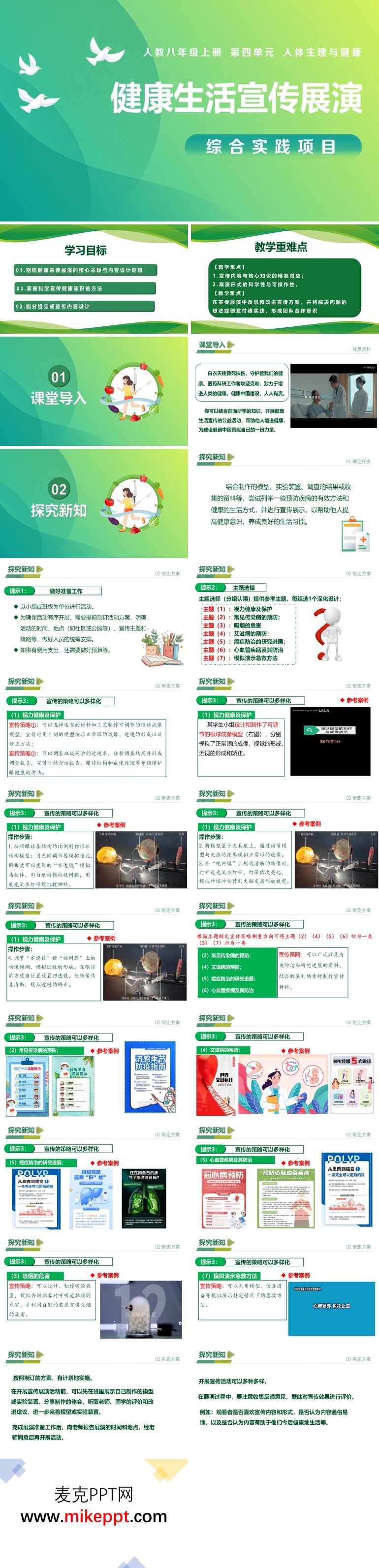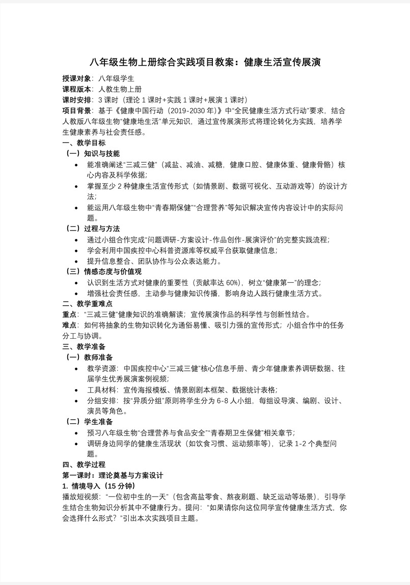 这套共32张幻灯片的演示文稿,专为八年级生物上册“综合实践项目——健康生活宣传展演”量身打造,它像一台“健康传播孵化器”,把课堂变成学生自主策划、自编自导的“微型公益节”。整节课以“三减三健”(减盐、减油、减糖,健康口腔、健康体重、健康骨骼)为核心议题,通过“一条主线、三轮驱动、四种角色”让学生经历完整的项目化学习:主线是“从获取知识到影响他人”,三轮驱动指“调研—设计—展演”,四种角色则对应“调研员、策划师、创作者、评估员”,在“看、析、编、演、评”的沉浸式流程中,把健康理念转化为可传播、可互动、可评估的公共作品,真正实现“学以致用、知行合一”。 第一幕“情境导入”,教师先播放一段30秒公益短片:一位少年每天“快乐水+炸鸡”套餐,三个月后体检报告全线飘红,镜头定格在他面对医生时震惊的表情。强烈的视觉冲击瞬间激活学生共鸣:“这不就是我同桌的日常吗?”由此抛出驱动性问题——“怎样让同龄人一听就懂、一看就改?”课堂氛围迅速升温。 第二幕“探究新知”,任务单下发,教室变身“健康传媒公司”。①调研部:学生用5分钟在线问卷速访校内100名同学,收集“最爱零食TOP10”与“每日屏幕时长”数据,自动生成云图,直观呈现“高盐高糖”与“久坐不动”两大痛点。②策划部:基于数据,每组选定“三减三健”中最触动的子主题,用“电梯陈述”30秒内向班级拉票,胜出主题进入下一轮。③创作部:方案通过后,学生从“情景剧、互动游戏、科普说唱、快闪实验”四种形式中任选两种进行混搭,例如把“减糖”做成“奶茶盲测”互动摊,把“健康骨骼”拍成1分钟“钙先生与维生素D小姐”木偶剧,既符合科学逻辑,又自带社交传播属性。④评估部:各组完成初稿后,先交叉试演,用“观众停留率+知识问答正确率”双指标进行A/B测试,再依据反馈迭代脚本,确保信息精准、节奏紧凑、形式吸睛。 第三幕“课堂总结”,教师将32张幻灯片自动拼成一幅“项目长卷”,从调研数据云图、策划思维导图、彩排照片到最终展演海报,按时间轴滚动播放,学生边看边完成“KWL”反思表:已知(K)—想知(W)—学知(L),在复盘中提炼“信息检索、脚本写作、舞台调度、团队协作”四项关键能力,实现元认知升级。 第四幕“课堂练习”,采用“即学即测+真实任务”双轨并行:选择题用在线抢答,数据实时排名;解决问题则要求学生在放学前把最终展演方案浓缩成140字“健康推文”并配图,上传至学校公众号,24小时内阅读量与点赞数将作为过程性评价依据,让“课堂作品”真正走向“公众传播”,也让“健康生活”从一次项目升华为持续的生活方式。