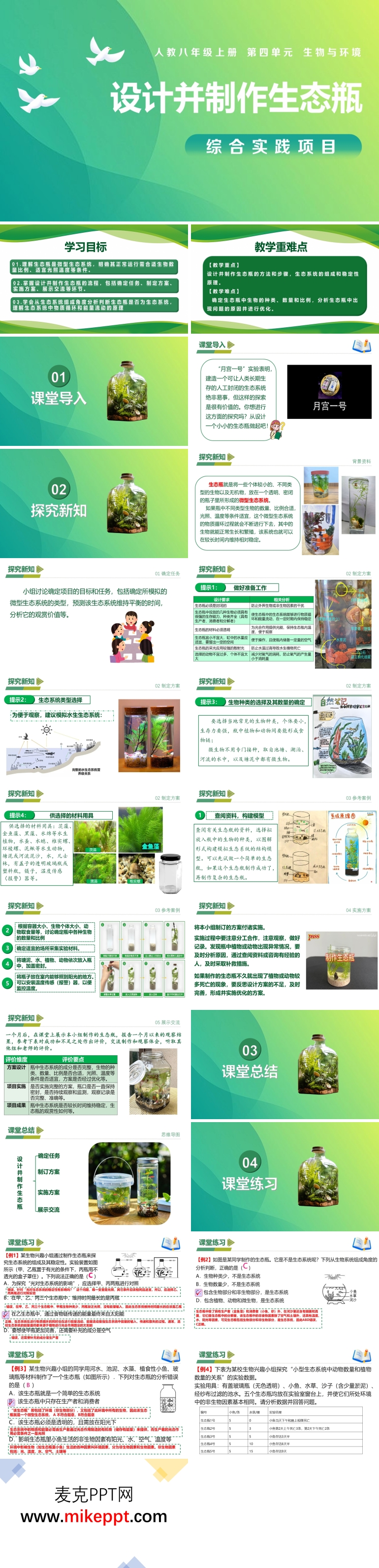 这份共25页的PPT,紧扣八年级生物上册“综合实践项目——设计并制作生态瓶”,像一台“微型地球孵化器”,把课堂搬进玻璃瓶,让学生亲手搭建、长期观察、反复调试一个自给自足的生态系统。整节课以“一月宫、一瓶世界、一条链”贯穿始终:先用“月宫一号”深空闭合实验点燃好奇心,再落到“生态瓶”微观模型,最后通过“方案—实践—优化”三阶链条,引导学生体验“科学家思维+工程师手法+环保者情怀”的三重身份,在真实任务中理解“生产者、消费者、分解者、非生物环境”四大成分的动态平衡,感受科学探究的严谨与创造乐趣。 第一幕“情境导入”,教师播放90秒“月宫一号”纪录短片:志愿者封闭生存370天,靠植物、微生物、人协同循环空气、水、食物,镜头最后定格在舱内微小的一株拟南芥。学生惊叹:“原来太空生存就是放大版的生态瓶!”问题随即抛出——“能否把地球缩进一只玻璃瓶,让它永久运转?”探究欲望瞬间被点燃。 第二幕“探究新知”,教室变身“生态工程实验室”。①任务确定:每组抽取不同“生态位卡片”——沙漠、池塘、雨林、苔原,决定瓶内生物种类与数量上限,倒逼学生先查阅光照、水分、温度数据,建立“量入为出”的科学态度。②方案设计:用A3网格纸绘制“物质循环示意图”,标注“水草产氧—小虾消耗—微生物分解—泥沙缓冲”的闭环路径,教师以“如果分解者过多会怎样?”等追问,训练系统思维。③动手实践:学生自带透明玻璃瓶、河沙、池塘水、水草茎段、苹果螺或小虾,现场装配并测量初始溶氧量、pH值,数据录入共享表单,为后续对比提供证据。④成果展示:瓶体贴上二维码,扫码即可查看该组的“生态护照”——设计思路、生物清单、预期平衡曲线;教室窗台设置“生态瓶长廊”,每周定时拍照上传,自动生成延时视频,让“微小变化”可视化,持续激发观察热情。 第三幕“课堂总结”,师生共绘“知识+过程”双思维导图:左脑图用颜色区分四大成分及其能量流动方向,右脑图以时间轴方式回顾“假设—操作—证据—反思”的探究环节,突出“异常数据也是宝贵资源”的科学精神;同时挑选“最先出现藻类暴绿”与“最迟动物死亡”两瓶做对比剖析,引导学生领悟“生态平衡是动态而非静止”的核心概念,顺势升华环保意识——地球亦是一枚巨大生态瓶,人类必须节制欲望,维护系统稳定。 第四幕“课堂练习”,采用“即时问卷+远程挑战”双轨:线上5道选择题自动批改,巩固基础概念;线下则布置“生态瓶2.0”迭代任务——利用寒假时间更换单一变量(如光照角度、水量10%),记录对比数据,开学举办“最长存活瓶”与“最美平衡态”双奖项评比,让科学探究从45分钟延伸到21天,甚至更久。学生带着作品离开教室时,真正体会到:科学不是黑板上的符号,而是手中正在呼吸的“小地球”;环保不是口号,而是每一次微调背后的敬畏与责任。