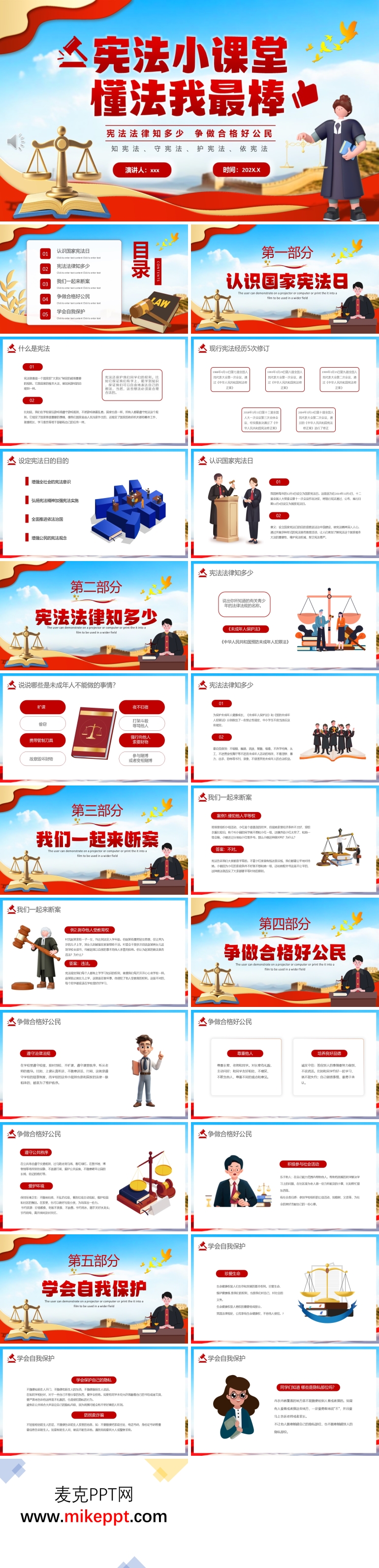 当法治的阳光照进校园,宪法教育便不再是抽象的法条堆砌,而是青少年成长路上不可或缺的“权利指南针”。这套精心设计的27页宪法科普PPT,正是要将国家根本大法的厚重内涵,转化为孩子们听得懂、记得住、用得上的生动知识,让宪法精神真正在年轻一代心中扎根发芽。 宪法教育为何要从娃娃抓起?因为宪法并非遥远的政治宣言,而是与每个公民的一生息息相关——从出生的那一刻起,我们的人格权便受宪法保护;走进学校,受教育权成为宪法赋予的神圣承诺;即便将来步入社会,劳动权、休息权、选举权等无一不是宪法的具体化身。通过系统化的普法课堂,不仅能帮助青少年建立正确的权利义务观,更能培养他们用法治思维解决问题的能力,这既是个人成长的必修课,也是国家法治建设的基石。 这套PPT的五个板块层层递进,构成完整的认知闭环。开篇以“认识国家宪法日”为切入点,不仅阐释宪法的根本法地位,更深入挖掘设立国家宪法日的深层意义——它不仅是纪念日,更是全民的“宪法教育日”,提醒我们每个人都要成为宪法的忠实崇尚者。第二板块“宪法法律知多少”巧妙选取《未成年人保护法》《预防未成年人犯罪法》等与青少年密切相关的部门法,通过宪法“母法”与部门法“子法”的关系梳理,让学生直观理解法律体系的内在逻辑。 最富互动性的当属“我们一起来断案”环节,这里摒弃了枯燥的说教,代之以贴近校园生活的真实案例:比如同学间的恶作剧是否构成侵权?网络打赏行为是否有效?这些情境化案例引导学生化身“小法官”,在讨论与辨析中领悟宪法原则如何具体适用。随后“争做合格好公民”板块则上升到价值引领,将宪法规定的公民义务转化为可践行的日常行动,从尊重国旗国歌到维护公共秩序,让宏大叙事落地为文明细节。最后的“学会自我保护”板块更是点睛之笔,教授学生在面对校园欺凌、网络陷阱等现实风险时,如何运用法律武器捍卫自身权益,实现从“知法”到“用法”的跃升。 当课堂上的宪法科普结束,其影响却在校园内外持续发酵。孩子们开始主动讨论“我的权利”,懂得监督与维权并行;家长们反馈孩子回家后会纠正不文明行为,法治意识悄然渗透家庭。这种润物无声的教育,正逐步构建起“学校—家庭—社会”三位一体的普法网络,让宪法从文本走向生活,从理念化为行动,最终汇聚成建设法治中国的青春力量。