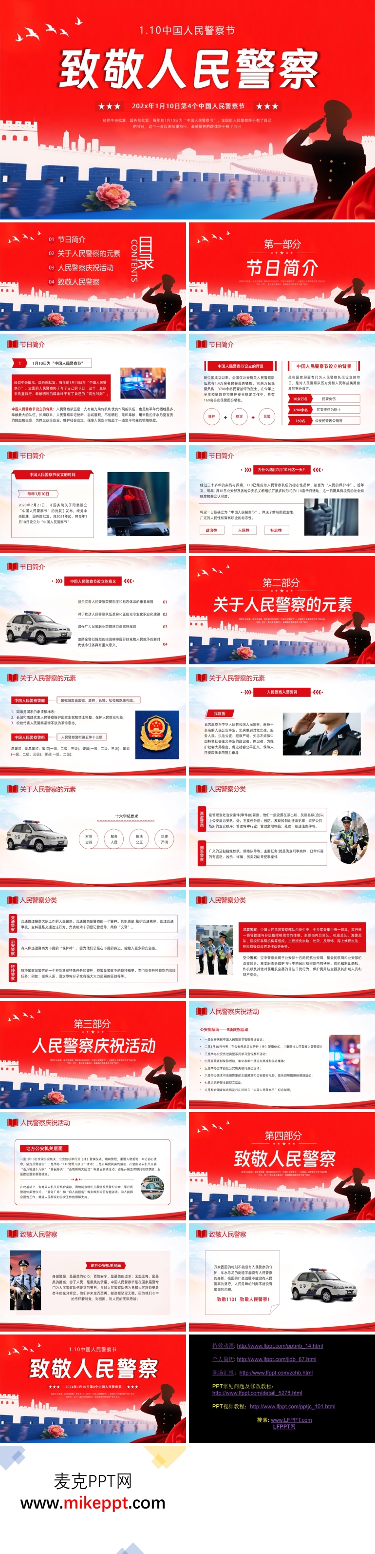 PPT模板内容主要通过PowerPoint软件分几个部分来向我们展开介绍有关于致敬人民警察学习课件的相关内容。PPT模板内容第一部分主要向我们详细的介绍了中国人民警察日的由来。第二部分主要向我们详细的讲解了有关于中国人民警察的元素。第三部分主要向我们详细讲解了有关于人民警察庆祝活动的相关内容。最后一部分主要是有关于致敬人民警察的相关内容。
