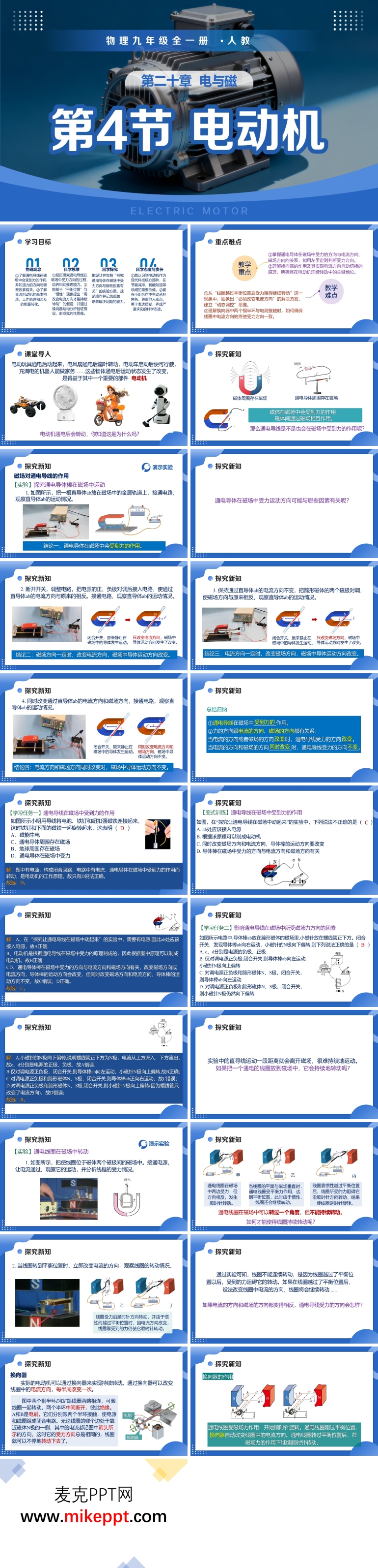 这套专为人教版九年级物理第二十章《电与磁》第四节“电动机”量身定制的PPT模板,依托PowerPoint精心打磨42张幻灯片,以“从生活走向物理,从物理走向社会”为主线,将“磁场对电流的作用”这一核心规律逐层展开,带领学生完成“现象—建模—应用—创新”的完整学习闭环。课堂伊始,教师先抛出学生最熟悉不过的场景:遥控车飞驰、电扇摇头、地铁启动、破壁机轰鸣,随即定格电机特写,抛出问题:“是谁把电能悄悄变成转动?”一句追问瞬间点燃好奇,顺势引出本节三大任务:第一,用实验再现“通电导线在磁场中受力”这一关键现象,借助铜棒、U形磁体、滑动变阻器搭建探究平台,让学生亲自动手改变电流方向、磁场方向,记录导轨上铝棒滚动方向的“左右反转”,从而归纳“力的方向同时取决于电流方向与磁场方向”的左手定则;第二,把单根导线扩展成矩形线圈,用三维动画演示线圈在“平衡位置”卡顿的尴尬,再对比引入换向器的“巧妙翻身”,让学生眼见为实“直流电动机持续转动”的秘密,并板书能量流向图:电能→机械能+少量内能;第三,回归生活,拆解废旧光盘驱动器,清点磁体、电刷、线圈、换向器四大件,用“零件—结构—功能”表格把抽象原理锚定在实物之上。探究环节后,用“一分钟快问快答”+“电动机模型故障诊断”双轨练习即时诊断,再把知识网缩成一张可折叠的思维导图钉入学生笔记本。课后作业分层设计:基础层完成教材“动手动脑”第1~3题,提高层用电池、磁铁、铜丝制作简易电动机并拍视频上传,拓展层查阅资料说明“无刷电机”如何甩掉换向器,为下一节“磁生电”埋下伏笔。整套模板配色清新、动画克制,既保留物理课堂的逻辑严谨,又兼顾九年级学生的视觉冲击需求,让“电动机”不再只是课本上静止的插图,而成为学生指尖跃动的科技精灵。