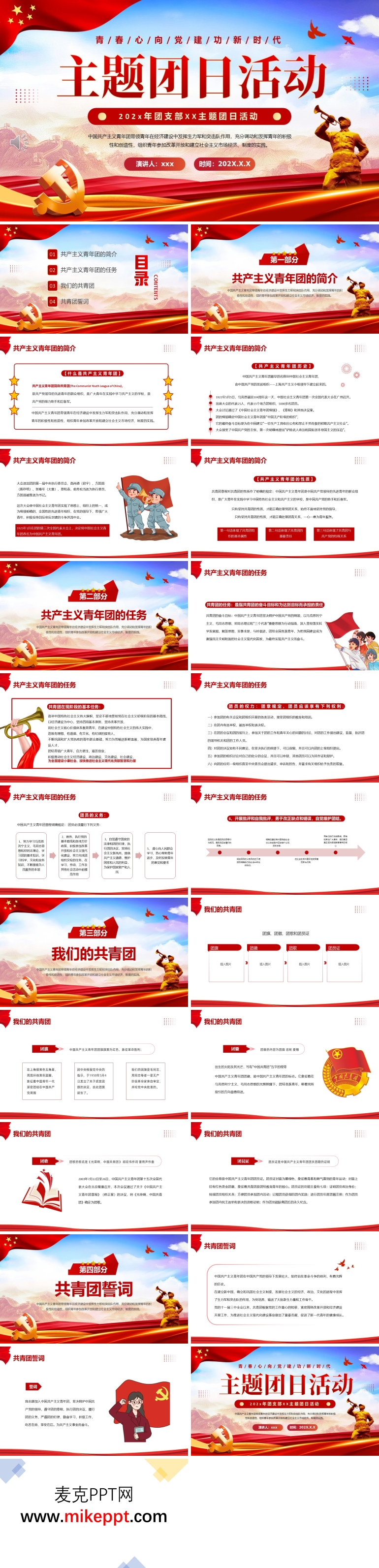 这套精心设计的团支部主题团日活动动态PPT模板,以23张幻灯片为载体,系统构建起青年思想引领的立体化教育场景。作为共青团组织生活的核心载体,主题团日活动的质量直接关系到团员青年政治素养的淬炼效果,该模板正是基于这一深层逻辑,将抽象的组织规范转化为可感知、可互动的视觉语言。 第一部分"共青团之光"开篇立意,以时间轴形式串联起从1922年建团至今的峥嵘岁月,通过百年团史的纵深叙述,彰显"党有号召、团有行动"的政治基因;在性质界定上,不仅重申"党的助手和后备军"的根本定位,更结合新时代语境,诠释共青团在青年发展、社会治理中的桥梁纽带作用,让历史厚重感与时代使命感交相辉映。第二部分"使命与担当"形成有机对话,一方面梳理共青团在新时代"培养社会主义建设者和接班人"的根本任务,另一方面通过权利义务清单的对照呈现,引导团员认知"权利是组织的信任,义务是政治的承诺",特别设计"青年突击队""志愿服务"等实践场景插图,强化责任具象化表达。 第三部分"我们的身份标识"成为视觉高潮,以高清矢量图展示团徽齿轮麦穗的工业美学、团旗鲜红底色上的金星跃动感,配以标准五线谱展示的《光荣啊,中国共青团》旋律线,更创新性地纳入团员证内页防伪细节解读,每个符号都配有二维码链接至沉浸式AR讲解,实现从平面认知到数字体验的跨越。第四部分"铮铮誓言"采用动态文字效果,逐字呈现入团誓词,背景融入天安门、长城等象征性元素,配合宣誓场景的实拍图,营造出庄严肃穆的仪式氛围,最后一帧定格在"随时准备为共产主义事业而奋斗"的特写,余韵悠长,激发青年心底的红色信仰。 整套模板突破传统说教范式,以视觉叙事重构红色教育话语体系,既保留政治严肃性,又注入青春气息,是基层团支部提升组织生活质量的得力工具。
