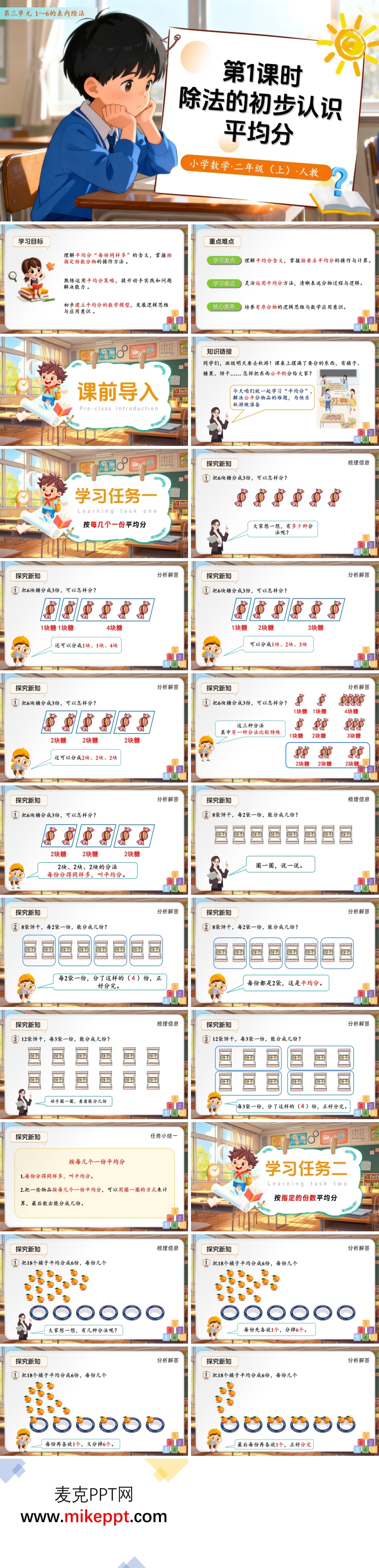 这套围绕“人教版二年级数学上册第三单元第1课时——除法的初步认识·平均分”的演示文稿共39张幻灯片,是教师组织课堂的“立体地图”。整节课以“理解平均分的本质、掌握平均分的操作、感受数学与生活的联系”为三大核心目标,层层递进。开课时,教师先创设“分糖果”“分橘子”等真实情境,把“每份同样多”的生活经验唤醒,再抛出“怎样让每只小兔吃到一样多的胡萝卜”这一挑战性任务,让学生带着问题走进新课。紧接着,通过“看一看、摆一摆、说一说、比一比”四类数学活动,学生用手中的小棒、圆片、电子白板拖拽等多元方式,把“平均分”从具体形象过渡到半抽象,再上升到数学符号表达。在小组合作环节,学生既要分工记录,又要轮流表达“我把几个物体平均分成几份,每份几个”,语言与动作同步,动手、动口、动脑协同,操作能力与表达能力得到双提升。教师还设计了“错题医院”和“生活超市”两大练习板块:前者呈现非平均分、不完全平均分的典型错例,让学生当“小医生”找病因、开药方;后者则把“平均分”嵌入生日分蛋糕、小组合租车费、植树分组等真实任务,引导学生用数学眼光观察生活,用数学思维解决实际问题。课堂尾声,学生用“我学会了……我发现……我想问……”的句式进行反思,教师借助思维导图梳理知识脉络,把“平均分”牢牢钉在“除法”这一更大的知识框架上。整堂课在“情境—探究—应用—升华”的循环中完成,学生不仅知道了“平均分”的含义和操作方法,更体会到数学就在身边,学习兴趣悄然生长。