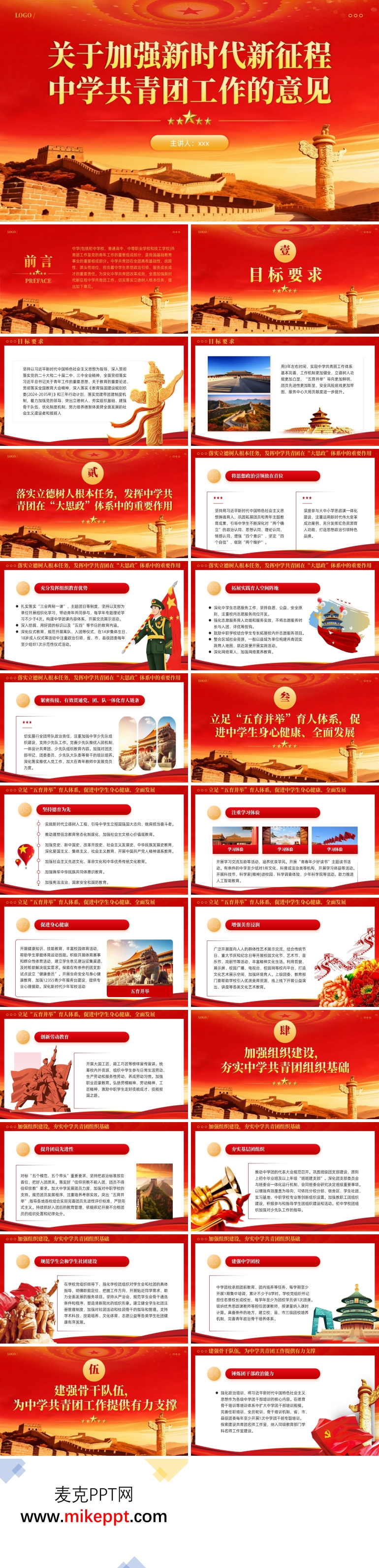 PPT模板内容主要通过PowerPoint软件分几个部分来向我们展开介绍有关于加强新时代新征程中学共青团工作的意见课件的相关内容。PPT模板内容第一部分主要向我们介绍了加强共青团管理的目标和要求。第二部分主要向我们介绍了有关于“落实立德树人根本任务”的重要性。第三部分是“五育并举”的相关内容。第四部分主要是有关于加强共青团组织建设的相关内容。第五部分是“建强骨干队伍”的相关内容。最后一部分是强化机制建设的相关内容。