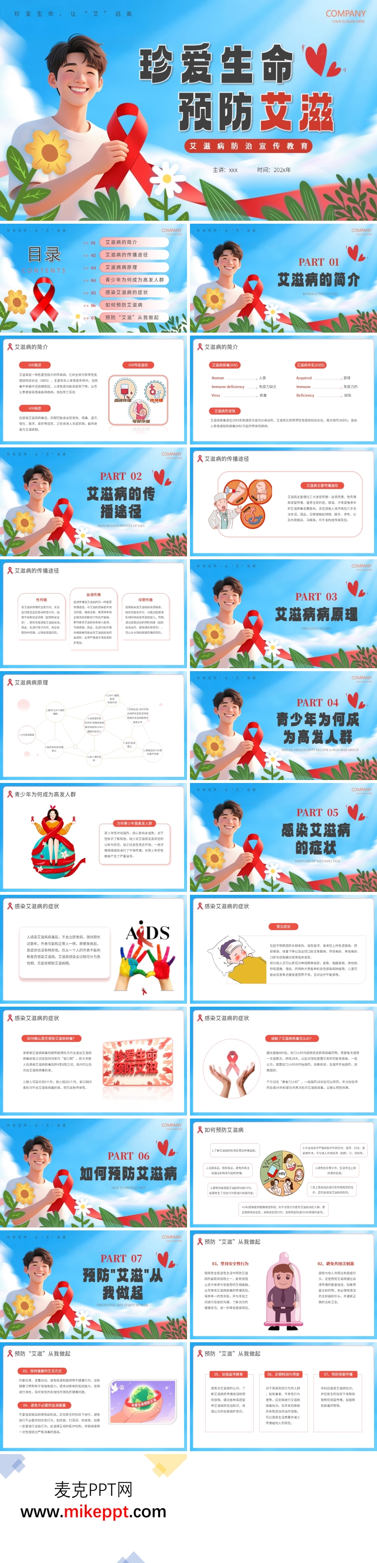 这套聚焦"生命至上·共抗艾滋"主题的宣传教育班会PPT模板,以24张逻辑严密的幻灯片构建起青少年健康教育完整 framework。在全球化流动加速、高危行为低龄化趋势凸显的当下,将艾滋病防治知识系统化、场景化传递,已成为学校生命安全教育的刚性需求,该模板正是回应这一时代命题的专业工具。 认知建构层由前三部分奠定科学根基:"疾病溯源"篇不仅界定HIV病毒作为逆转录病原体的生物学特性,更以时间轴形式还原1981年首例确诊病例的全球公共卫生史意义,奠定敬畏生命的情感基调;"传播机制"篇突破传统三大途径的平面罗列,而是通过病毒载量曲线、体液交换模型等可视化手段,深度解析血液、性接触、母婴垂直传播的生物学本质与条件概率,破除"日常接触传播"等认知迷思;"病理演进"篇则模拟病毒攻击CD4+T淋巴细胞的微观过程,从急性感染期到艾滋病期的临床分期图谱,让抽象免疫损伤具象可感。 第四、五部分构成危机预警双引擎:针对青少年成为新发感染"增长极"的社会现实,从性生理成熟提前与防护意识滞后的心理错位、同伴压力下的风险试探、新媒体暗流中的性信息污染等维度开展归因分析,直击校园教育痛点;"症状辨识"篇采用症状矩阵图,区分急性逆转录综合征的类流感表现与机会性感染的指征性特征,强调窗口期检测的关键意义,培养"早期识别、主动干预"的医学警觉。 第六、七部分则转向行为赋能:"预防体系"篇整合生物医学预防(PrEP暴露前用药)、行为干预(ABC原则)、社会支持(免费自愿咨询检测点)三级网络,提供可操作的决策工具包;终章"责任践行"通过情景模拟与角色扮演设计,将"使用安全套""拒绝共用针具""消除歧视"等具象行为升华为公民健康责任,最后一帧以红丝带缠绕的青春剪影定格,实现从知识传递到价值内化的教育闭环。