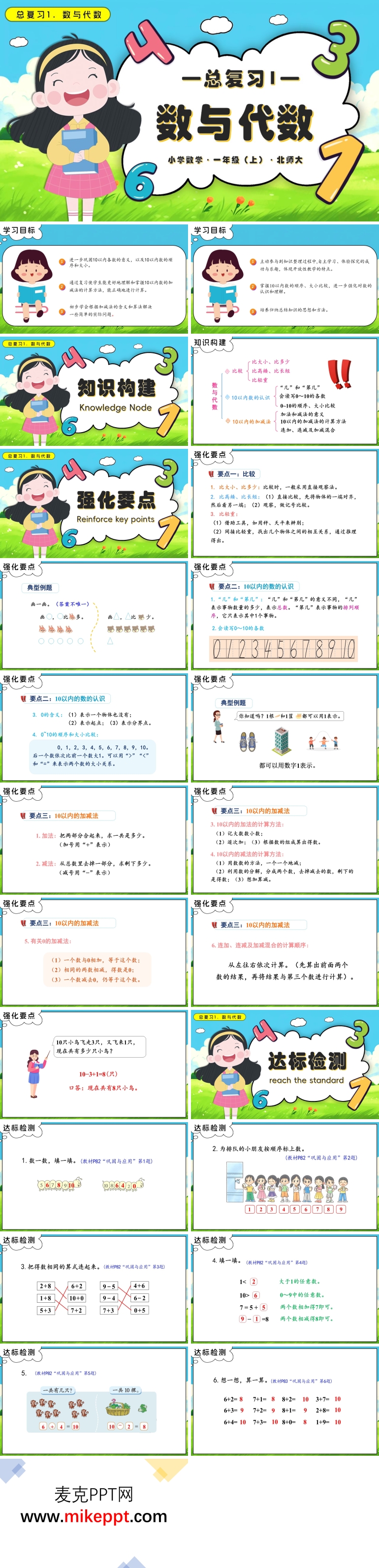这是一套专为北师大版一年级上册数学总复习第 1 节“数与代数”设计的 PPT 课件模板,共包含 27 张幻灯片。本节课的核心内容是数与代数,重点在于帮助学生掌握 20 以内数的认识,并使他们能够熟练认读 20 以内的数。为了实现这一目标,PPT 模板采用了情境教学法和游戏教学法,旨在通过生动有趣的学习方式激发学生的学习兴趣,让他们在“快乐学习”的氛围中巩固加减法运算能力。 PPT 模板内容通过 PowerPoint 软件精心编排,分为四个部分逐步展开。第一部分详细介绍了数与代数的基本概念。通过简洁易懂的语言和生动的图示,帮助学生理解数的顺序、大小关系以及加减法的基本含义。例如,通过数数游戏和实物演示,让学生直观地感受到数字的递增和递减规律,为后续的学习奠定基础。 第二部分聚焦于知识点构建和教学导入。通过创设与生活实际相关的情境,如购物场景、水果分配等,引导学生进入学习状态,激发他们的学习热情。同时,通过逐步引导学生回顾已学知识,帮助他们建立起数与代数的知识框架,使学生能够系统地理解和掌握相关概念。 第三部分是强化要点环节。这一部分通过大量的练习题和互动游戏,帮助学生巩固 20 以内数的认识和加减法运算。例如,设计“数的接龙”游戏,让学生依次说出相邻的数字;通过“找朋友”游戏,帮助学生理解加减法的互逆关系。这些游戏不仅增加了课堂的趣味性,还帮助学生在轻松的氛围中加深对知识的理解和记忆。 最后一部分是达标检测和课堂小结。通过精心设计的练习题,全面检测学生对本节课知识的掌握程度。这些练习题涵盖了 20 以内数的认识、加减法运算等多个方面,旨在从不同角度考查学生的学习效果。同时,通过课堂小结,引导学生回顾本节课的重点内容,帮助他们梳理知识脉络,进一步巩固所学知识。 总的来说,这套 PPT 课件模板通过科学合理的结构设计和多样化的教学方法,将数与代数的理论知识与趣味教学相结合,旨在帮助一年级学生在轻松愉快的氛围中掌握 20 以内数的认识和加减法运算。通过情境教学和游戏互动,学生能够更好地将数学知识与生活实际相联系,从而激发他们对数学学习的兴趣,培养他们的数学思维能力和运算能力。