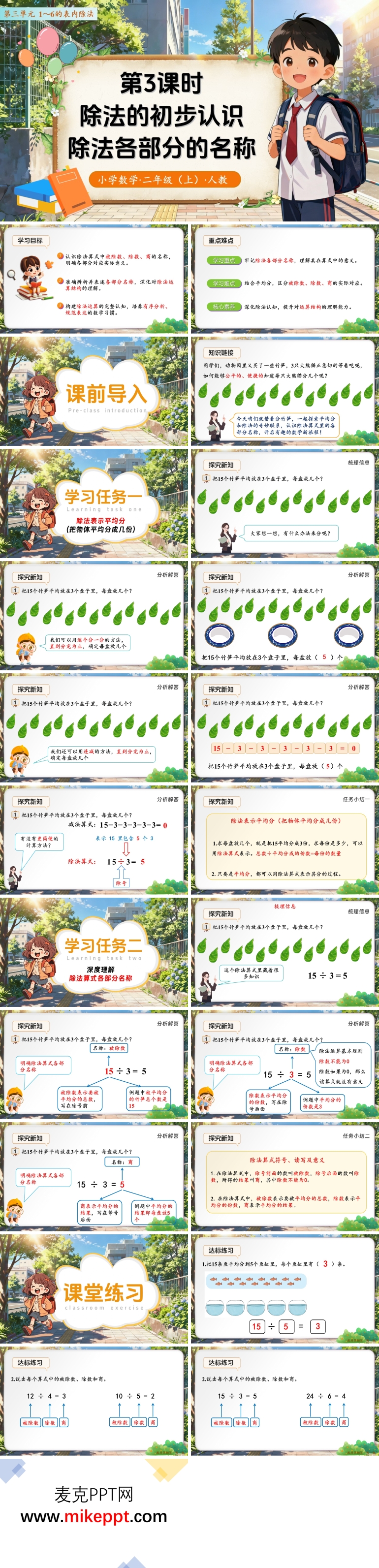 这份专为人教版二年级数学上册第三单元第3课时“除法的初步认识——除法各部分的名称”定制的27页演示文稿,像一座层层升起的“知识脚手架”。课堂伊始,教师用“还记得怎样让每只小兔吃到一样多的胡萝卜吗?”这一旧知提问,迅速唤醒学生对“平均分”的记忆,再顺势抛出“分竹笋”的新情境:15支竹笋平均放到3个盘里,每盘几支?孩子们带着问题走进“操作场”,或摆小棒、或画圆圈、或拖拽白板图标,把“分”的过程外显化。教师并不急于给出答案,而是鼓励四人小组“分头行动”:有人负责分、有人负责记录、有人负责检查是否“同样多”,还有人负责把分的结果写成算式。当不同小组展示“15÷3=5”时,教师适时请出“除法家族”四位成员——被除数、除数、商和除号,让它们一一“登台亮相”,学生通过“叫名字、摆位置、说意义”的趣味互动,把抽象术语与具体操作一一对应,初步的逻辑思维在“做—说—抽象”的循环中悄然生长。随后的“填一填”“算一算”分层练习,既有“看图写算式”的直观题,也有“听故事填名称”的语言题,还有“逆向思考”的开放题:已知商和除数,猜被除数,让思维再度爬坡。课堂小结时,学生用“今天我认识了……我能用除法讲……”的模板进行微型演讲,教师再用思维导图把“平均分—除法算式—各部分名称”锁成一个牢固的“三角结构”。延伸至课后的“家庭小任务”,孩子们要帮家长把20双筷子平均放进4个抽屉,并拍照标注“被除数、除数、商”发班级群,数学知识由此从课内走向生活,学习兴趣在真实任务中被再次点燃。