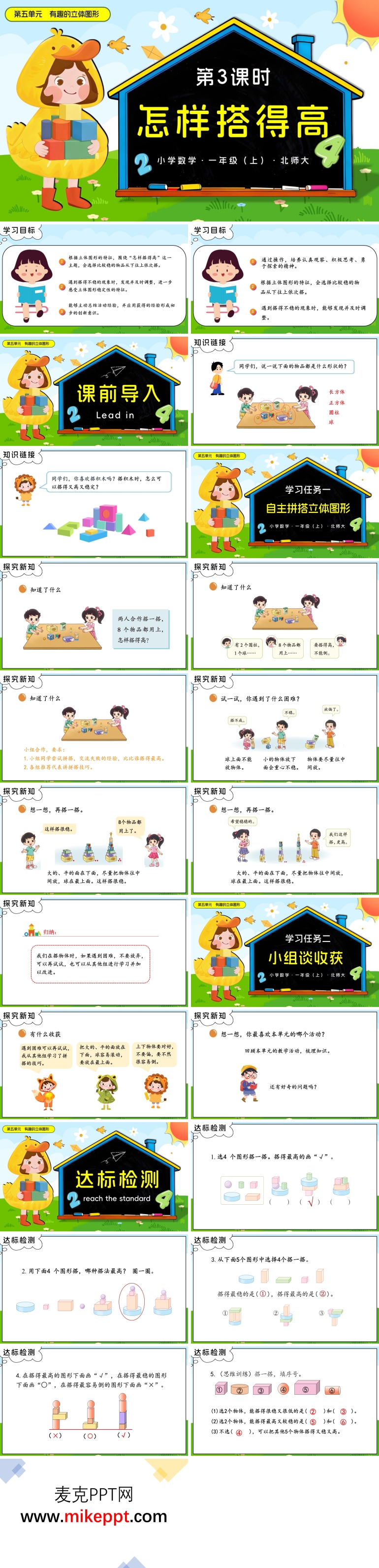 这是一套专为北师大版一年级上册数学第五单元第 3 课时“怎样搭得高”设计的 PPT 课件模板,共包含 27 张幻灯片。在本单元前两课时的学习中,同学们已经对立体图形的基本特征有了初步的了解。本节课将在此基础上,引导学生将所学的立体图形特征应用于实际问题的解决中,通过“怎样搭得高”的问题引入,激发学生的学习兴趣,培养他们的动手能力和空间思维能力。 PPT 模板内容通过 PowerPoint 软件精心编排,分为四个部分逐步展开。第一部分详细介绍了知识链接,帮助学生回顾之前所学的立体图形特征。通过复习长方体、正方体、圆柱和球体等图形的特征,如长方体有 6 个面且相对面相等,正方体的 6 个面完全相同,圆柱上下两个面是圆形等,为后续的实践活动做好铺垫。同时,通过提问和互动,引导学生思考这些特征在实际搭建中的作用,帮助学生建立起知识与实践之间的联系。 第二部分是“自主拼搭立体图形”。这一部分是本节课的核心实践环节。通过创设“怎样搭得高”的问题情境,引导学生利用手中的立体图形积木进行自主拼搭。学生需要根据各图形的特点,思考如何将这些图形组合起来,使搭建的结构尽可能高且稳定。例如,长方体和正方体由于底面较大,可以作为底层支撑;圆柱体则可以通过叠加实现高度的增加。在这一过程中,学生不仅能够巩固对立体图形特征的理解,还能通过实际操作,培养他们的动手能力和空间想象力。 第三部分是“小组谈收获”。在学生完成自主拼搭后,组织小组讨论,分享各自的搭建方法和收获。通过小组交流,学生可以相互学习,了解不同的搭建策略,并从中总结经验。例如,有的小组可能会发现将正方体和长方体组合使用可以增加稳定性,而圆柱体则更适合用于高度的提升。这一环节不仅培养了学生的合作意识和交流能力,还帮助他们在思维碰撞中进一步深化对知识的理解。 最后一部分是课堂总结。通过回顾本节课的重点内容,帮助学生梳理知识脉络,巩固所学知识。教师可以引导学生总结不同立体图形在搭建过程中的优势和局限,并强调在实际应用中灵活运用这些特征的重要性。同时,通过展示一些优秀小组的搭建成果,激发学生的学习兴趣,鼓励他们在课后继续探索和实践。 总的来说,这套 PPT 课件模板通过科学合理的结构设计和丰富的互动内容,将理论知识与实践活动相结合,旨在帮助一年级学生在轻松愉快的氛围中掌握“怎样搭得高”的方法。通过知识链接、自主拼搭、小组交流和课堂总结,学生不仅能够巩固对立体图形特征的理解,还能培养他们的动手能力、空间思维能力和合作意识,为他们的数学学习和未来发展奠定坚实的基础。