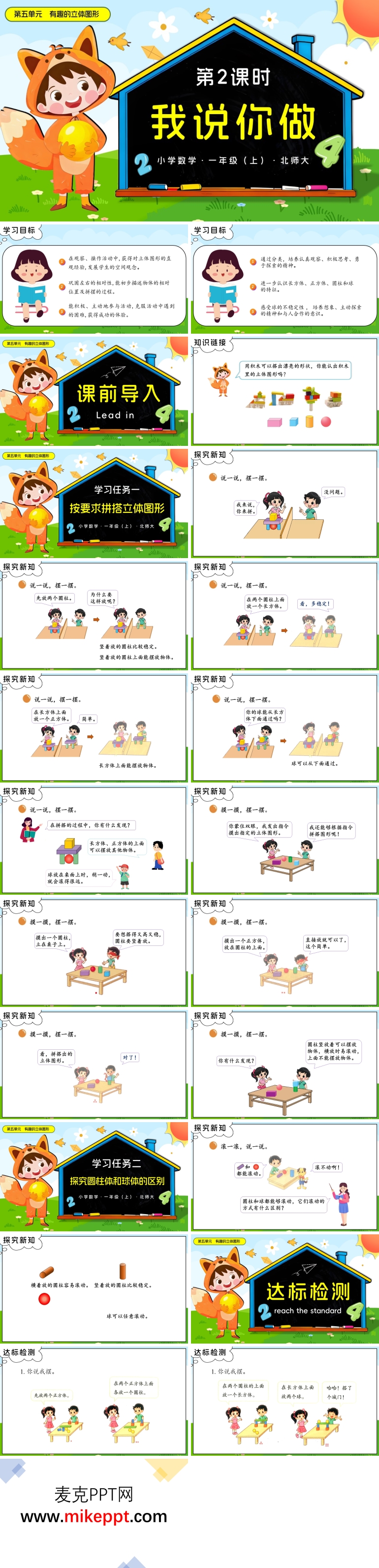 这是一套专为北师大版一年级上册数学第五单元第 2 课时“我说你做”设计的 PPT 课件模板,共包含 30 张幻灯片。在上一节课中,同学们已经学习了一些平面图形,而本节课的重点将转向立体图形。常见的立体图形包括长方体、正方体(立方体)和圆柱体等。学习立体图形不仅有助于学生认识更多形状,还能有效锻炼他们的空间思维能力。为了更好地实现这一目标,本套 PPT 模板通过游戏化的教学形式,引导学生在轻松愉快的氛围中掌握本节课的重点和难点知识。 PPT 模板内容通过 PowerPoint 软件精心编排,分为四个部分逐步展开。第一部分是课前导入环节。通过展示生活中常见的立体图形物品,如魔方(正方体)、牙膏盒(长方体)、易拉罐(圆柱体)等,引导学生回顾已有的生活经验,激发他们对立体图形的兴趣。同时,通过提问和互动,帮助学生初步感知立体图形的基本特征,为后续的学习做好铺垫。 第二部分是“按要求拼搭立体图形”。这是本节课的核心实践环节,通过设计一系列有趣的拼搭任务,引导学生根据指令完成立体图形的搭建。例如,教师可以要求学生用长方体和正方体搭建一座小房子,或者用圆柱体搭建一个简单的塔。在这一过程中,学生需要根据图形的特征进行合理选择和组合,从而加深对立体图形特征的理解。同时,通过小组合作的形式,培养学生的团队协作能力和动手操作能力。 第三部分是探究圆柱体和球体的区别。通过对比展示圆柱体和球体的实物或图片,引导学生观察和总结它们的特征差异。例如,圆柱体有两个圆形的底面,侧面是曲面,而球体则是完全的曲面,没有底面。通过实际操作,如滚动圆柱体和球体,让学生直观感受它们在运动方式上的不同:圆柱体只能沿一个方向滚动,而球体可以向任意方向滚动。这一环节通过对比和实践操作,帮助学生深入理解圆柱体和球体的特征,进一步提升他们的空间思维能力。 最后一部分是达标检测环节。通过设计一系列与本节课内容相关的练习题,全面检测学生对立体图形知识的掌握程度。这些练习题包括选择题、判断题和简单的拼搭设计题,旨在从不同角度考查学生对立体图形特征的理解和应用能力。同时,通过及时反馈和讲解,帮助学生巩固所学知识,查漏补缺。 总的来说,这套 PPT 课件模板通过科学合理的结构设计和游戏化的教学方式,将立体图形的理论知识与实践操作相结合,旨在帮助一年级学生在轻松愉快的氛围中掌握立体图形的基本特征。通过课前导入激发兴趣、拼搭实践加深理解、对比探究强化认知以及达标检测巩固知识,学生不仅能够提升空间思维能力,还能在动手操作中培养合作意识和创新精神,为他们的数学学习和未来发展奠定坚实的基础。