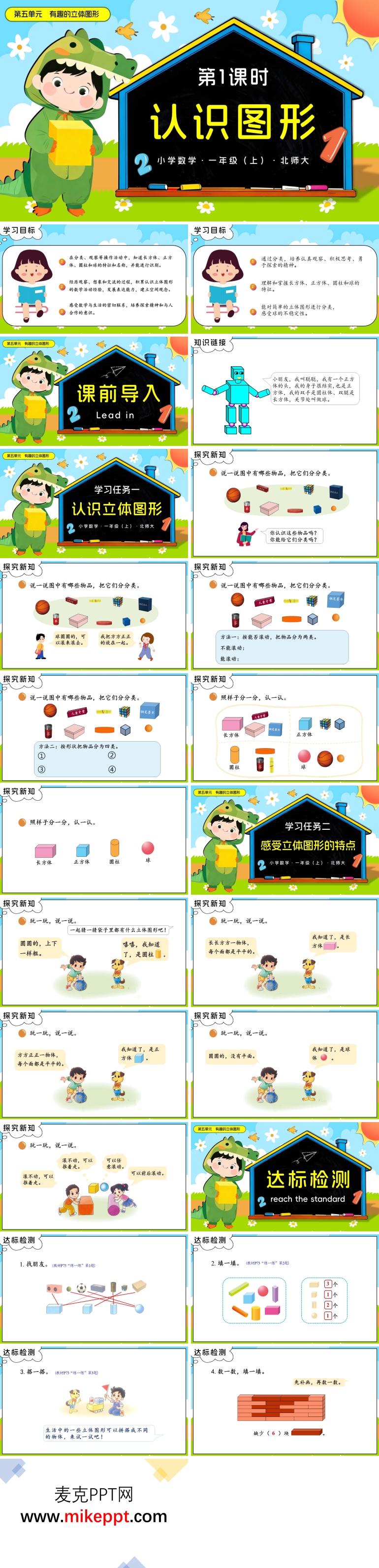 这是一套专为北师大版一年级上册数学第五单元第一课时“认识图形”设计的 PPT 课件模板,共包含 28 张幻灯片。图形作为数学学科的核心要素之一,是孩子们在接触数学学习时的重要内容。在数学学习的初始阶段,数字和图形是孩子们最先接触的两个领域。图形不仅能够帮助孩子们构建数学学习的基本框架,还能有效培养他们的数学思维能力和空间想象力。本套 PPT 模板主要围绕三角形、正方形、长方体、正方体和圆柱等基本图形展开教学,旨在帮助学生初步认识这些图形的特征,并通过多种教学活动加深理解。 PPT 模板内容通过 PowerPoint 软件精心编排,分为四个部分逐步展开。第一部分是学习目标与学习重点的介绍。在这一部分,明确提出了本节课的学习目标,包括能够识别和命名常见的平面图形(如三角形、正方形)和立体图形(如长方体、正方体、圆柱)。同时,强调了学习重点,即掌握这些图形的基本特征,如正方形的四条边相等、四个角都是直角,圆柱的上下两个面是圆形且侧面是曲面等。通过清晰的目标设定,帮助学生在学习过程中有的放矢。 第二部分聚焦于图形基本特征的教学。通过生动的图片、动画演示和实物展示,帮助学生直观地认识长方体、正方体和圆柱等立体图形的基本特征。例如,通过展示不同大小和颜色的长方体,引导学生观察其面、棱和顶点的特征;通过滚动圆柱和球体的对比实验,让学生直观感受圆柱的运动特性。这一部分通过多种教学手段,帮助学生从视觉、触觉等多个感官角度认识图形,增强学习的趣味性和实效性。 第三部分是习题练习环节。通过设计多样化的练习题,包括选择题、连线题和简单的图形拼搭题,帮助学生巩固所学知识。例如,通过展示一组图形,让学生选择哪些是长方体、哪些是圆柱;通过拼搭游戏,让学生用积木拼出指定的立体图形。这些练习题不仅考查学生对图形特征的掌握程度,还培养了他们的动手操作能力和逻辑思维能力。 最后一部分详细讲解了立体图形的分类。通过系统的分类方法,帮助学生理解不同立体图形之间的相似性和差异性。例如,将长方体和正方体归为一类,因为它们都有 6 个面、12 条棱和 8 个顶点,但正方体的 6 个面完全相同,而长方体的相对面相等。通过分类讲解,帮助学生建立起系统的知识结构,进一步提升他们的空间思维能力。 总的来说,这套 PPT 课件模板通过科学合理的结构设计和丰富的教学内容,将图形的认识与数学思维的培养相结合。通过明确学习目标、直观教学图形特征、设计多样化的练习以及系统讲解图形分类,学生不仅能够初步认识常见的平面和立体图形,还能在学习过程中培养空间想象力和逻辑思维能力。这种循序渐进的教学方式,为孩子们的数学学习奠定了坚实的基础,也为他们未来的学习和发展提供了有力的支持。