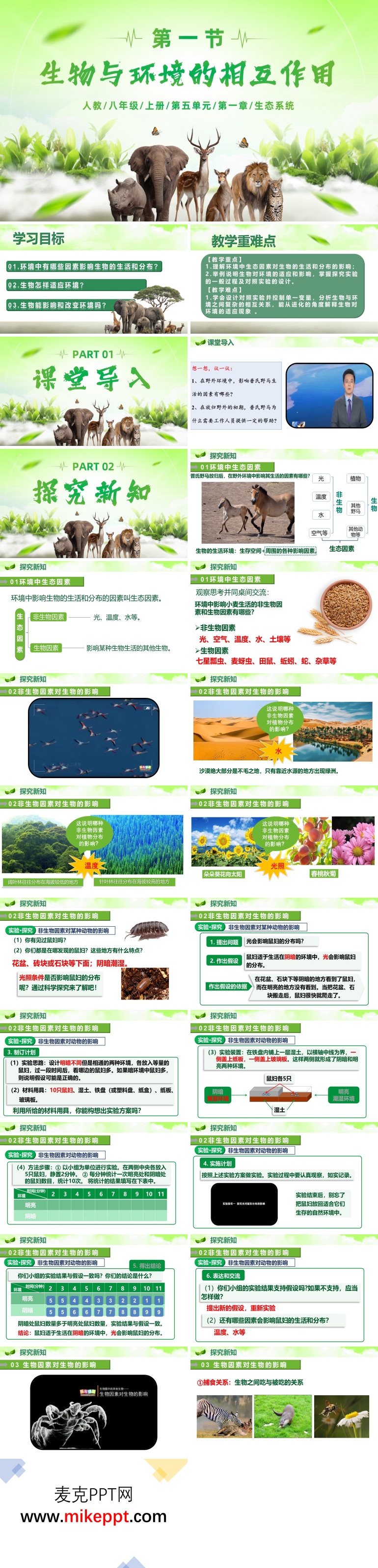这是一套专为人教版生物八年级上册第 5 章第 1 节“生物与环境的相互作用”设计的 PPT 课件,共包含 44 张幻灯片。本节课的核心目标是帮助学生深入理解生物与环境之间的复杂关系,引导他们认识环境中影响生物生存的非生物因素(如温度、光照、水分等),并准确把握生态因素的概念。同时,通过对比分析,学生将学会区分生物因素和非生物因素对生物的不同作用机制。更重要的是,本节课旨在培养学生运用生物学知识解释现实生活中生物与环境关系的能力,使他们能够将理论知识与实际生活紧密结合,提升科学素养。 为了实现这些教学目标,PPT 课件精心设计了四个部分的内容。第一部分是课堂导入环节。通过播放一段生动的自然纪录片视频,吸引学生的注意力,激发他们的学习兴趣。视频内容展示了野马在野外的生活场景,随后引导学生思考:在这样的自然环境中,哪些因素会影响野马的生存?这种情境导入不仅能够引发学生的思考,还能自然地引出本节课的核心问题——生物与环境的相互作用。 第二部分是探究新知环节,这是本节课的核心内容。这一部分围绕四个关键知识点展开:首先是生态因素的概念,帮助学生理解生态因素包括生物因素和非生物因素两大部分;接着深入探讨非生物因素对生物的影响,通过具体的实例分析,如温度对植物分布的影响、水分对沙漠生物生存的限制等,让学生直观感受到非生物因素的强大力量;第三部分聚焦于生物因素对生物的影响,通过分析生物之间的捕食、竞争、共生等关系,引导学生理解生物之间的相互作用;最后,探讨生物对环境的适应和影响,通过展示生物适应环境的奇妙方式(如北极狐的白色皮毛、仙人掌的针状叶)以及生物对环境的改造(如蚯蚓改良土壤、植物的蒸腾作用调节气候等),帮助学生全面理解生物与环境之间的相互依存关系。 第三部分是课堂总结环节。通过思维导图的形式,将本节课的复杂知识点进行系统梳理和整合。思维导图以“生物与环境的相互作用”为核心,分支包括生态因素、非生物因素的影响、生物因素的作用以及生物对环境的适应和影响等。这种可视化的方式不仅帮助学生清晰地回顾本节课的重点内容,还能促进他们构建完整的知识体系,加深对知识的理解和记忆。 第四部分是课堂练习环节。通过设计多样化的练习题,包括选择题、填空题和简答题,全面考查学生对本节课知识的掌握程度。练习题紧密结合生活实际,引导学生运用所学知识解决实际问题,如分析某一地区生物多样性丰富的原因、解释某种生物适应环境的特征等。通过课堂练习,教师可以及时了解学生的学习情况,发现并解决学生存在的问题,同时也能帮助学生巩固知识,提升应用能力。 综上所述,这套 PPT 课件通过科学合理的结构设计和丰富多样的教学内容,将生物与环境的复杂关系以生动易懂的方式呈现给学生。从情境导入激发兴趣,到探究新知深化理解,再到课堂总结梳理知识,最后通过课堂练习巩固应用,整个教学流程环环相扣,旨在帮助学生全面掌握生物与环境相互作用的核心知识,培养他们的科学思维和实践能力,为后续的生物学学习奠定坚实的基础。