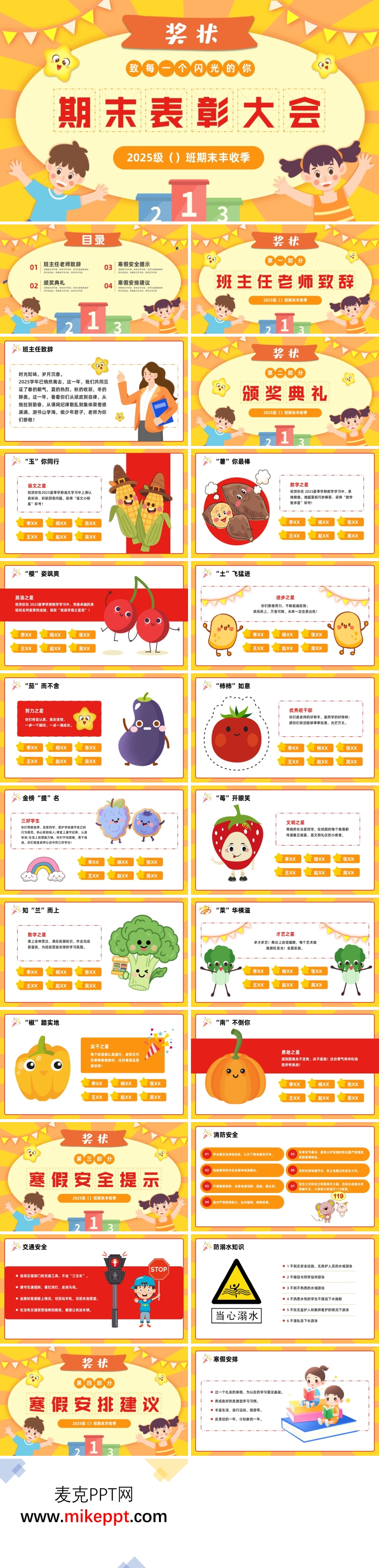 这是一套精心设计的期末颁奖表彰PPT课件,共包含29张幻灯片,围绕期末颁奖这一主题,从四个方面展开,旨在对本学期学生的表现进行总结与表彰,同时为即将到来的寒假做好规划和安全教育。 第一部分:班主任老师致辞 PPT的开篇部分由班主任老师致辞,正式拉开期末颁奖表彰活动的序幕。班主任的讲话不仅是对全班同学本学期学习和生活的总结,更是对学生未来发展的鼓励与期望。通过班主任的深情寄语,学生能够感受到老师对他们的关心与支持,为后续的颁奖环节营造积极向上的氛围。 第二部分:颁奖典礼 颁奖典礼是本次PPT的核心内容,旨在表彰本学期表现优异的学生。奖项设置丰富多样,涵盖语文之星、数学之星、英语之星、进步之星、努力之星、优秀班干部、三好学生、文明之星、勤学之星、才艺之星、实干之星和勇敢之星等。这些奖项不仅肯定了获奖学生的努力与成就,也为其他同学树立了榜样。通过表彰这些优秀学生,鼓励全班同学在学习和生活中互相学习、共同进步,形成良好的班级竞争氛围。 第三部分:寒假安全提示 在表彰学生的同时,PPT还特别关注学生的寒假安全。这一部分以安全教育为主题,详细讲解了消防安全、交通安全和防溺水知识。通过生动的案例和实用的建议,帮助学生在假期中增强安全意识,掌握必要的安全技能。这一环节不仅体现了学校对学生的全面关怀,也确保学生在假期中能够安全度过,为新学期做好准备。 第四部分:寒假安排建议 PPT的最后一部分为学生提供了寒假安排建议。寒假不仅是学生放松和休息的时间,更是提升自我、丰富生活的好机会。建议学生在假期中保持良好的学习习惯,合理安排时间,进行体育运动、阅读、旅游等活动,培养全面发展型的学习习惯。通过这些活动,学生不仅能够巩固所学知识,还能拓展视野,为新学期的学习奠定坚实基础。 整套PPT课件通过精心设计的四个部分,将期末表彰、安全教育和假期规划有机结合,既肯定了学生本学期的努力,又为他们的未来发展提供了指导。这种全面而细致的设计,不仅增强了学生的自信心和成就感,还帮助学生在假期中保持积极的生活态度和良好的学习习惯,为新学期的到来做好充分准备。