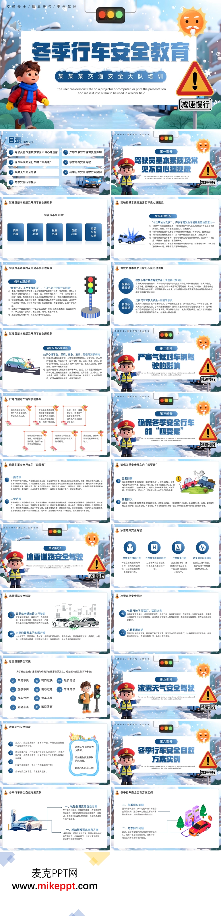 随着2025年冬季的临近,低温、冰雪、雾霾等恶劣天气条件对道路交通安全构成了严峻挑战。为有效应对季节性风险,一套系统化的冬季行车安全教育方案应运而生。该演示文稿共包含30张专业幻灯片,从多维度构建起完善的安全知识体系,不仅强调驾驶技能的提升,更注重安全责任意识的深层培育。 面对因严寒气候引发的交通事故频发态势,强化冬季驾驶专项培训已成为保障出行安全的当务之急。道路结冰、能见度降低、车辆性能衰减等客观因素显著增加了驾驶难度,这要求驾驶员必须主动掌握针对性防护技能。与此同时,人的因素始终是安全链条的核心环节——驾驶员既要精通车辆维护保养知识与特殊路况操控技巧,更要持续强化自我健康管理能力,杜绝疲劳驾驶与侥幸心理,真正实现从"要我安全"到"我要安全"的观念转变,为自身与公众的生命财产安全筑起坚实防线。 整套课件科学划分为七大模块:第一模块聚焦驾驶员心理层面,深度剖析冬季行车中常见的五种不良心理状态,如急躁冒进、过度自信、麻痹大意等,通过心理画像与行为后果的关联分析,帮助驾驶者建立风险预警思维。第二模块从技术与物理层面解读低温环境对车辆制动系统、胎压、电瓶及橡胶部件的潜在影响,强化预防性检查意识。第三模块提炼出"防冻、防滑、防雾、防火"四要素为核心的安全框架,系统阐释冷却液选用、轮胎防滑链配置、除雾设备使用及防静电火灾的关键要点。第四、五模块分别针对冰雪路面与雾天两类高危场景,传授起步、转向、制动、会车的精细化操作要领。第六模块通过真实事故案例推演冬季被困、打滑、失控等险情的科学自救流程,提升应急处置能力。第七模块则以简洁有力的提示语,将复杂知识转化为易于记忆的行车规范,确保安全意识内化于心、外化于行。