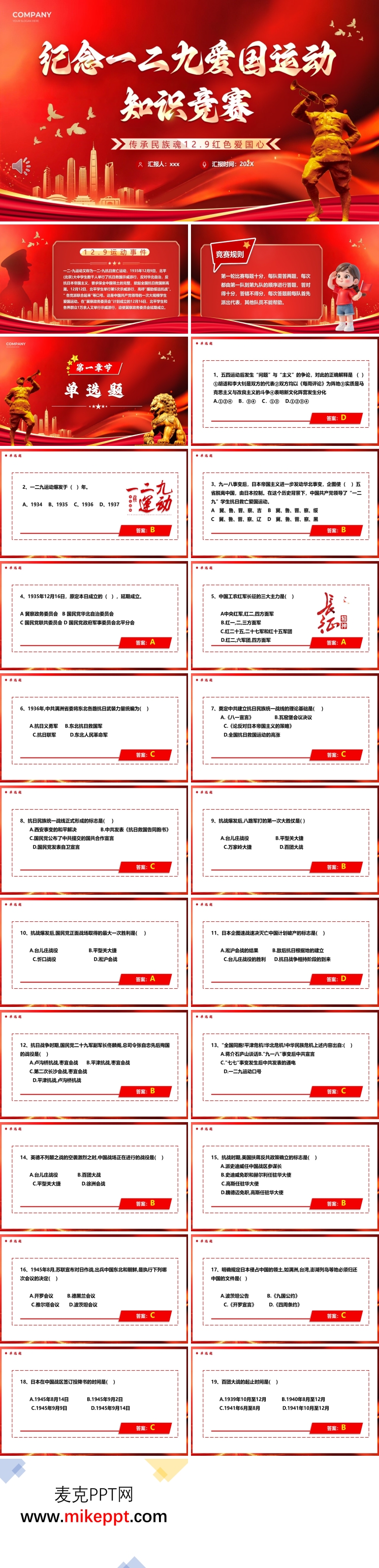 铭记历史、传承精神,是新时代青年筑牢理想信念的必修课。1935年12月9日,在中国共产党的领导下,北平青年学生掀起了声势浩大的抗日救亡运动,以英勇无畏的姿态发出了"停止内战,一致对外"的时代强音。这场由青年学生担当先锋的爱国运动,不仅深刻推动了全民族抗战的进程,更铸就了以爱国主义为核心的"一二·九"精神丰碑。为引导当代青年学生铭记这段光辉历史,赓续红色血脉,一套精心策划的纪念"一二·九"运动知识竞赛PPT课件应运而生,通过43张逻辑严谨、内容翔实的幻灯片,构建起沉浸式学习教育平台。 该课件突破传统说教模式,以竞赛为载体激发学习内驱力,整体设计遵循"规则先行—层层递进—全员参与"的科学路径。首部分聚焦竞赛机制,系统阐释计分原则与团队协作规范,特别强调"独立作答"的核心要求——每队选派代表答题且禁止队员提示,这一设计既考验个人知识储备,又锤炼选手的心理素质与临场应变能力,确保竞赛的公平性与严肃性。第二部分单选题环节,围绕运动背景、发展脉络、历史影响等基础知识设置精要题目,通过即时问答形式深化对核心史实的记忆与理解。第三部分多选题模块则重在考察综合分析能力,题目涵盖运动意义、精神内涵、时代价值等延展性内容,引导青年从历史纵深与当代观照的双重视角进行深度思考,在辨析与选择中实现认知升华。 整套课件融知识性、竞技性与教育性于一体,将宏大叙事转化为青年喜闻乐见的学习场景,让历史照进现实,使红色基因在互动体验中薪火相传。