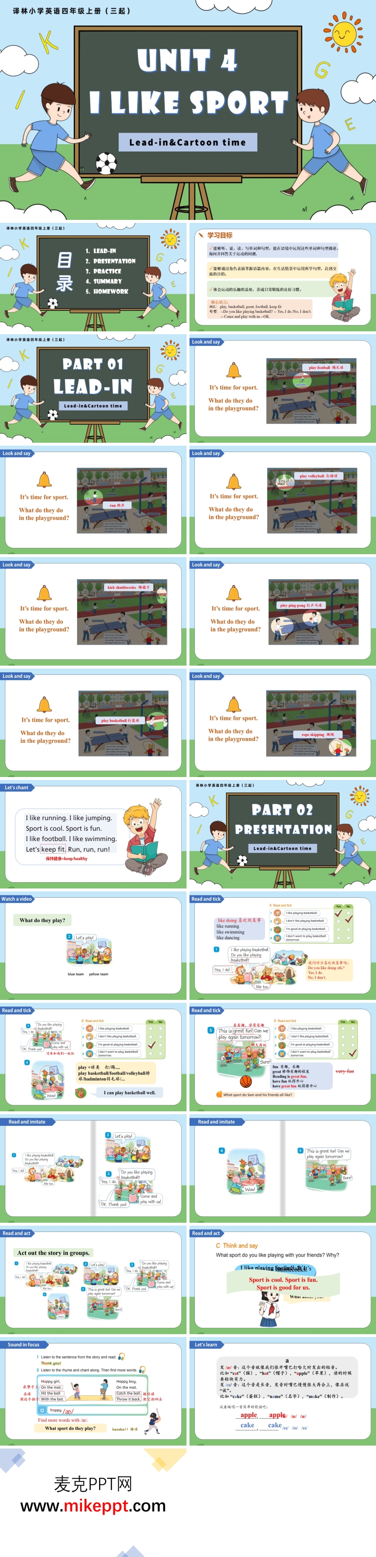 这是一套专为译林英语四年级上册Unit 4第1课时Cartoon time设计的PPT课件,共包含31张幻灯片。本节课的核心目标是帮助学生听懂并认读本课的核心词汇,掌握并运用核心句型“I like... Do you like...? Yes, I do...”。同时,通过本节课的学习,培养学生对运动的热爱,激发他们积极参与运动的兴趣。整套PPT课件从五个主要环节展开教学内容,每个环节都旨在通过多样化的教学活动,引导学生逐步深入理解文本,并在实践中运用所学知识。 第一部分是“Lead in”,这一环节通过模仿跟读词汇和学唱歌曲来激活学生的已有知识,初步理解单元主题。通过这种趣味性强的导入方式,学生能够快速进入学习状态,同时引出本节课的学习内容。例如,教师可以播放与运动相关的英文歌曲,让学生在欢快的旋律中感受运动的活力,从而自然地引入本节课的主题。 第二部分是“Presentation”,这一环节通过观察图片、预测情节、观看视频、验证猜测、自主阅读和逐图精读等环节,引导学生积极参与学习。首先,教师展示与课文相关的图片,引导学生观察并预测故事的情节,激发学生的好奇心和探索欲。接着,通过观看视频,学生可以验证自己的猜测,进一步理解故事内容。自主阅读和逐图精读则帮助学生深入理解文本中的语言细节。此外,通过跟读对话和分角色朗读,学生能够关注语音、语调和节奏等语言细节,从而深入理解文本内容。 第三部分是“Practice”,这一环节主要通过角色扮演等活动,帮助学生巩固并拓展语言运用能力。教师可以组织学生分组进行角色扮演,让学生在模拟的情境中运用核心句型进行对话。这种互动性强的活动不仅能够帮助学生巩固所学知识,还能培养他们的合作能力和自信心。例如,学生可以扮演故事中的角色,进行对话练习,从而在真实情境中运用语言。 第四部分是“Summary”,在这一环节中,教师带领学生对本节课所学的核心词汇、句型和故事内容进行系统总结。通过总结,学生能够巩固所学知识,梳理知识脉络,进一步加深对文本的理解。教师可以引导学生回顾本节课的重点内容,鼓励学生用自己的语言进行总结,从而提升学生的语言表达能力。 第五部分是“Homework”,教师布置与本节课内容相关的作业,帮助学生在课后继续巩固所学知识。作业可以包括书写练习、口语表达任务或简单的阅读活动,旨在让学生在课后继续运用所学语言,提升综合语言能力。例如,教师可以布置学生用英语写一篇关于自己喜欢的运动的小短文,或者与家人进行简单的英语对话练习。 整套PPT课件的设计充分考虑了学生的认知特点和学习规律,通过多样化的教学活动和精心设计的教学环节,引导学生从整体到细节逐步理解文本,并在实践中运用所学知识。通过本节课的学习,学生不仅能够掌握本单元的核心词汇和句型,还能在真实交流中提升语言表达能力和思维能力,同时培养对运动的热爱,为今后的英语学习奠定坚实基础。