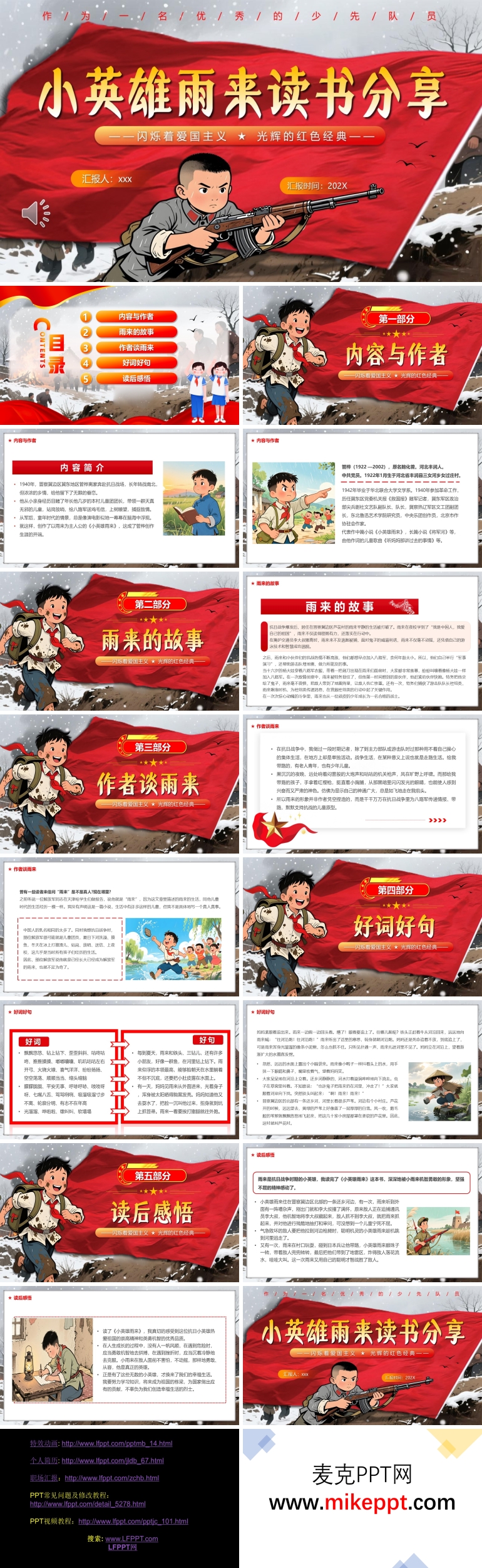 在烽火连天的抗战岁月中,一个普通乡村少年用稚嫩的肩膀扛起了保家卫国的时代重任,他的故事穿越历史烟云,至今仍在青少年心中激荡起爱国的澎湃力量——这就是《小英雄雨来》不朽的文学价值。这部红色经典以17张精心设计的读书分享PPT为载体,系统解构了雨来成长为抗日小英雄的心路历程,为当代青少年搭建起一座理解历史、传承精神的桥梁。 课件开篇深入作家管桦的创作世界,既还原了作者与主人公之间的情感渊源,又剖析了作品所处的历史语境与文学地位,让读者理解艺术真实与生活真实的深刻联结。第二部分聚焦雨来的英雄事迹,通过"夜送鸡毛信""智勇掩护八路军""宁死不屈守秘密"等经典情节,展现了一个十二岁少年如何在民族危亡之际,将朴素的乡土情怀升华为坚定的抗战信念,用行动诠释"天下兴亡,匹夫有责"的深刻内涵。 第三板块独辟蹊径,引入"作者谈雨来"的珍贵视角,呈现管桦先生对雨来精神的原点解读,以及这位曾并肩作战的战友对少年英雄人格魅力的深情追忆,赋予人物更厚重的历史质感。第四部分则回归文本细读,精选"像泥鳅一样滑""像小鸭子一样抖着头上的水"等富有童真又充满力量的经典语段,引导读者品味质朴语言中蕴含的鲜活生命力和革命乐观主义精神。 终章落脚于"读后感悟",不仅引导学生思考新时代如何践行雨来精神,更将个人成长与民族复兴紧密相连,激励青少年在和平年代依然要保持"时刻准备着"的警觉与担当。整套PPT以故事为经、以精神为纬,让红色基因在图文并茂、情理交融的分享中,真正融入年轻一代的血脉,实现革命传统教育的创造性转化与创新性发展。