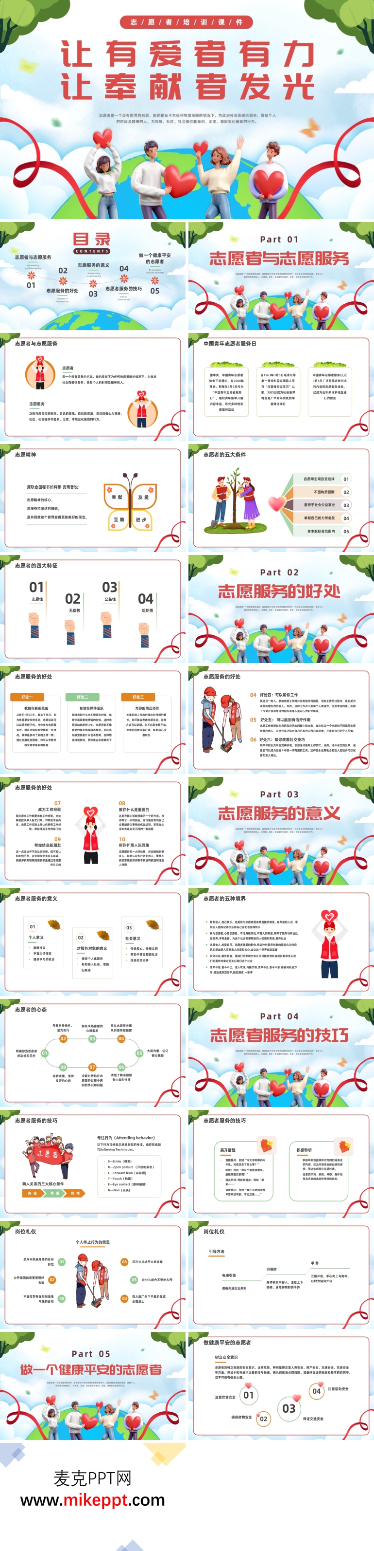 这是一套以“让有爱者有力,让奉献者发光”为主题的志愿者培训PPT课件,共包含26张幻灯片。该课件旨在通过系统的培训内容,帮助志愿者全面了解志愿服务的意义、价值和实践技巧,激发他们的奉献精神,提升志愿服务的质量和效果。 课件从五个主要方面展开培训内容,每个部分都围绕核心主题,通过理论讲解和实际案例相结合的方式,引导志愿者深入学习和思考。 第一部分是“志愿者与志愿服务”,这一环节主要介绍了志愿者和志愿服务的定义,帮助志愿者明确自己的身份和使命。同时,详细介绍了中国青年志愿者服务日的背景和意义,强调志愿精神的核心价值。此外,还阐述了成为一名志愿者需要具备的五大条件和四大特征,为志愿者树立了明确的标准和行为准则。 第二部分是“志愿服务的好处”,通过丰富的案例和数据,展示了志愿服务对个人成长的积极影响。例如,志愿服务可以教会志愿者新的技能,帮助他们保持积极的生活态度,为简历增添亮点。同时,志愿服务还能改善社交技巧,结交新朋友,拓展人际网络,提升个人的社会责任感和幸福感。 第三部分是“志愿服务的意义”,从个人、服务对象和社会三个层面展开讨论。对于个人而言,志愿服务是一种自我成长和实现的方式;对于服务对象,志愿者的帮助可以改善他们的生活质量;对于社会,志愿服务有助于构建和谐社区,促进社会的可持续发展。通过这一部分的学习,志愿者能够更深刻地理解志愿服务的价值和使命。 第四部分是“志愿者服务的技巧”,着重强调助人关系的三大核心条件:真诚、尊重和同情。真诚是建立信任的基础,尊重是维护他人尊严的前提,而同情则是理解他人情感的关键。通过这些技巧的学习,志愿者能够更好地与服务对象建立良好的关系,提供高质量的服务。 第五部分是“做一个健康平安的志愿者”,这一环节提醒志愿者在奉献爱心的同时,也要关注自身的健康和安全。通过合理安排时间、保持良好的心态和掌握必要的安全知识,志愿者可以在服务过程中保持健康,持续发光发热。 整套PPT课件的设计注重理论与实践相结合,通过生动的案例、实用的技巧和深入的思考,引导志愿者在奉献中成长,在服务中收获。通过本次培训,志愿者不仅能够提升自身的专业素养,还能在实践中更好地践行志愿精神,让爱与奉献的力量在社会中传递和闪耀。