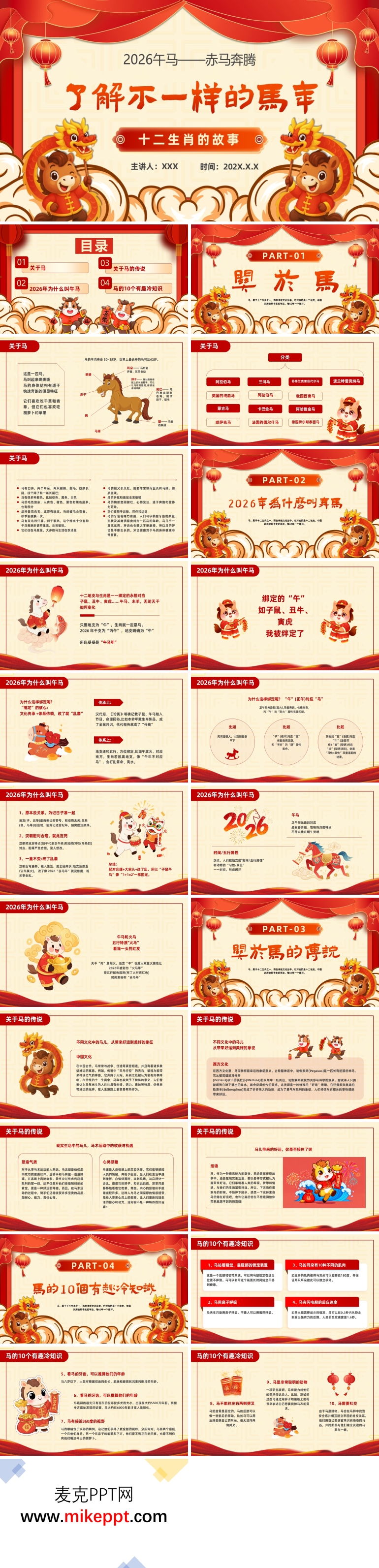 这是一套专为2026年马年设计的“午马新年祝福”主题PPT课件,共包含23张幻灯片。该课件通过丰富的内容和生动的形式,从四个方面展开对马年文化的介绍,旨在帮助学生深入了解马的特性、文化内涵以及与马相关的趣味知识,同时传递新年的美好祝福。 第一部分是“关于马”,通过一张高清的马的图片,引导学生细致观察马的身体结构,从头部到四肢,从鬃毛到尾巴,让学生对马的外形有直观的认识。随后,课件介绍了马的平均寿命一般为30~35岁,而世界上最长寿的马可达62岁,这一有趣的数字让学生对马的生命历程有了初步了解。接着,通过分类的形式,课件展示了世界各地不同品种的马,如阿拉伯马、蒙古马、汗血宝马等,每种马都有其独特的外貌特征和用途,帮助学生拓宽视野,了解马的多样性。 第二部分是“2026年为什么叫午马”,这一部分深入探讨了十二地支与生肖的永恒对应关系。通过生动的图表和详细的解释,学生可以了解到“午”在十二地支中位居第七,对应着夏季的正午时分,而马作为生肖之一,与“午”相匹配,因此2026年被称为午马年。课件通过历史渊源和文化背景的介绍,帮助学生理解生肖文化在中国传统文化中的重要地位,以及生肖与时间、自然的紧密联系。 第三部分是“关于马的传说”,这一部分从中国和西方两种文化视角出发,展示了马在不同文化中的美好象征。在中国文化中,马象征着力量、速度和坚韧,如“马到成功”“龙马精神”等成语,都体现了人们对马的喜爱和赞美。而在西方文化中,马也常常与勇气、自由和优雅联系在一起,如希腊神话中的飞马珀加索斯,象征着灵感与自由。通过这些故事和象征意义的介绍,学生能够感受到马在不同文化中的重要地位和深远影响。 第四部分是“马的十个有趣冷知识”,这一部分通过轻松幽默的方式,带领学生进一步了解马的奇特之处。例如,马是站着睡觉的,这是因为它们的腿部结构允许它们在站立时也能进入睡眠状态,以便随时应对危险;马只能用鼻子呼吸,这与它们的生理结构有关;此外,还可以通过观察马的牙齿来推算它们的年龄,因为马的牙齿会随着年龄增长而发生变化。这些有趣的冷知识不仅丰富了学生的知识储备,也激发了他们对动物学的兴趣。 整套PPT课件的设计注重知识性与趣味性的结合,通过生动的图片、详实的内容和互动式的讲解,引导学生在轻松愉快的氛围中了解马的特性、文化内涵和趣味知识。通过本次学习,学生不仅能对2026年午马年有更深刻的认识,还能在新年之际,将这些美好的寓意传递给身边的人,共同迎接充满希望和活力的新年。