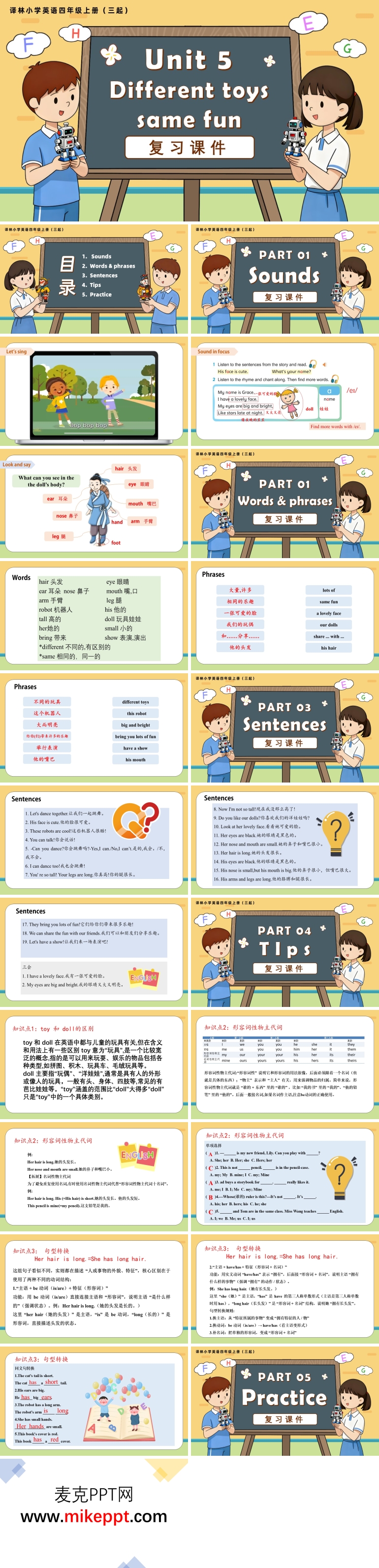 这是一套专为译林小学英语四年级上册(三起)Unit 5 “Different toys, same fun” 设计的复习课件,采用PowerPoint制作,共包含28张幻灯片。本节课的核心目标是帮助学生回顾和巩固本单元所学的玩具类词汇、重点单词和句型,使学生能够熟练运用所学内容介绍自己的玩具、询问他人是否拥有某物以及分享和询问喜好。通过系统的复习,学生将进一步提升语言运用能力和综合语言素养。 课件内容分为五个主要部分。第一部分是“Sounds”,主要引导学生复习字母A的发音,并结合本单元的一些单词进行练习。通过发音练习,学生能够巩固语音知识,为准确读出单词打下坚实基础。例如,通过复习“cat”“apple”等单词,学生可以更好地掌握字母A在不同单词中的发音规律。 第二部分是“Words and Phrases”,这一部分重点回顾本单元所学的单词和短语的发音、读音以及中文意思。通过图片、例句等多种形式,帮助学生加深对单词和短语的记忆和理解。例如,复习“doll”“robot”“kite”等玩具类单词时,搭配相应的图片,让学生在视觉和听觉的双重刺激下,更好地掌握这些词汇。 第三部分是“Sentences”,详细展开本节课的重点句型。通过例句、情景对话等形式,引导学生掌握如何运用句型进行交流。例如,复习“Do you have a toy car?”和“Yes, I do./No, I don’t.”等句型时,通过创设购物、分享玩具等情景,让学生在实际语境中练习使用这些句型,提高语言运用能力。 第四部分是“Tips”,主要引导学生对英文中易混的知识点进行区分和总结。例如,讲解“toy”和“doll”的区别,帮助学生理解“toy”是玩具的总称,而“doll”特指洋娃娃。此外,还介绍了形容词性物主代词的用法以及句型转换技巧,如将肯定句转换为一般疑问句等,帮助学生梳理知识体系,避免常见错误。 第五部分是“Practice”,通过设计与本单元相关的练习题,引导学生巩固所学知识。练习题形式多样,包括填空、选择、连线、对话练习等,旨在通过多样化的练习,帮助学生加深对单词、句型和语法知识的理解和记忆,同时培养学生的综合语言运用能力。 整套课件设计科学合理,内容丰富实用,通过系统的复习和多样化的练习,帮助学生全面回顾本单元的重点知识,提升语言运用能力,为后续学习奠定坚实基础。