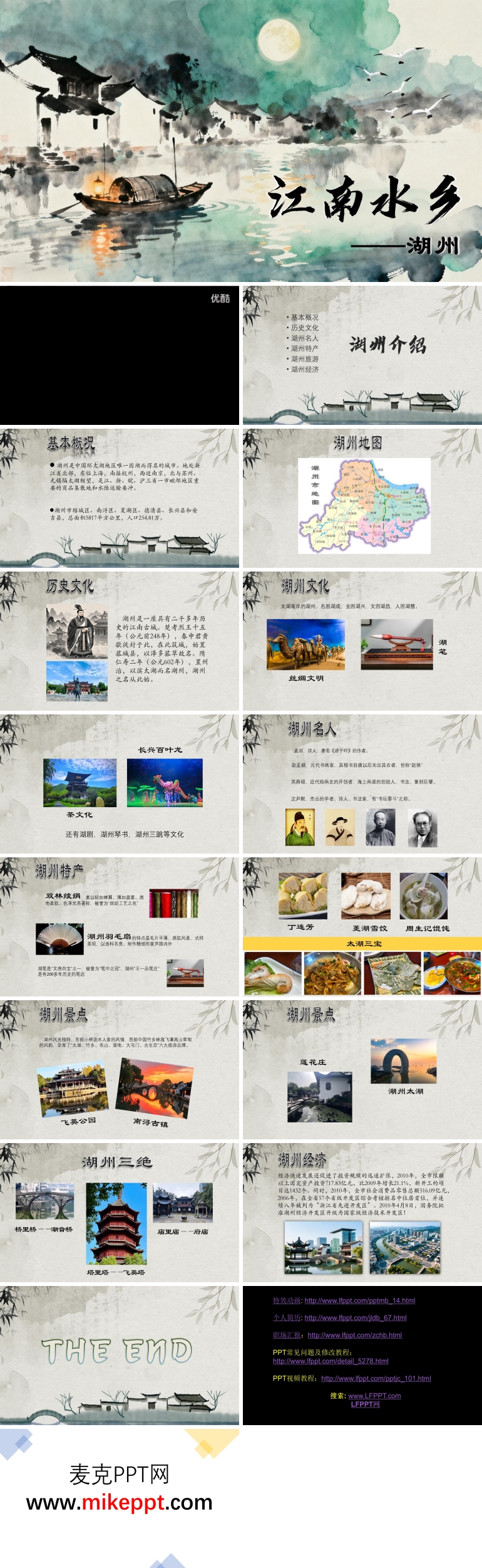 这是一套专为展现江南水乡湖州独特魅力而精心设计的PPT模板,由PowerPoint倾力打造,共涵盖16张精美幻灯片。湖州,这座镶嵌于浙江省北部的璀璨明珠,坐拥逾两千年深厚文脉,以其旖旎风光与悠悠古韵,成为无数旅人心驰神往的世外桃源。在这里,小桥流水人家的诗意画卷徐徐展开,为现代都市人提供了一方感受岁月静好、体验江南闲适的净土。 本演示文稿系统性地从六大维度勾勒湖州全貌:开篇"基本概况"追溯"湖州"之名渊源,并精准定位其地理坐标;继而"历史文化"篇章深入挖掘桑蚕丝织的辉煌文明与氤氲茶香的文化底蕴;"湖州名人"部分则致敬历代先贤,彰显人杰地灵之风范;"地方特产"环节聚焦湖州羽毛扇的精湛工艺与湖笔"毛颖之技甲天下"的美誉;"风景名胜"带领观众云游飞英公园的塔影婆娑、南浔古镇的百间楼回廊、莲花庄的荷风送爽,以及湖州太湖的碧波万顷;终章"经济发展"则展现古城在新时代浪潮中焕发的勃勃生机,实现传统与现代的和谐共生。整套模板融古典美学与现代表达于一体,是推介湖州、感知江南的绝佳载体。