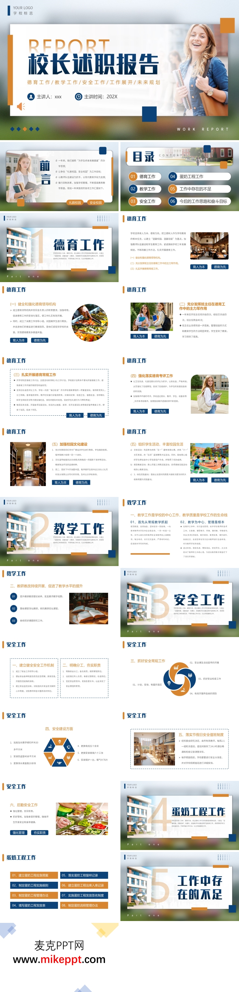 这是一套精心制作的校长述职报告PPT课件,共包含28张内容翔实的幻灯片,以系统化、结构化的方式从六个维度全面展现学校管理工作的核心要义与实践成果。 首部分聚焦德育工作,秉承"育人为本,德育为先"的教育理念,详细阐述德育管理体系的构建路径:通过健全强化德育领导机构,明确责任分工;充分发挥班主任在德育工作中的主力军作用,强化队伍建设;扎实开展行为规范、主题教育等德育常规工作;建立科学完善的德育考评机制,确保工作落实;同时注重校园文化建设,依托丰富多彩的学生活动,营造积极向上的育人氛围,实现全程育人、全方位育人。 第二部分紧扣教学工作这一学校中心工作,强调教学质量是立校之本、发展之基。课件从深化课堂教学改革、加强教学常规管理、完善质量监控体系等方面展开,突出教研教改的持续推动作用,通过校本研修、课题研究、集体备课等多元途径,促进教师专业成长与教学水平的整体提升,筑牢学校发展的生命线。 第三部分专项汇报安全机制建设,涵盖安全制度完善、应急预案演练、安全隐患排查等关键环节,构建平安和谐校园。第四部分详述蛋奶工程工作的实施情况,体现对学生健康成长的关怀保障。第五部分客观剖析工作中存在的不足,展现自我反思的严谨态度。第六部分则立足未来发展,明晰工作思路与奋斗目标,为下一阶段学校发展规划科学路径,确保各项工作有序衔接、持续推进,具有较强的指导性与前瞻性。