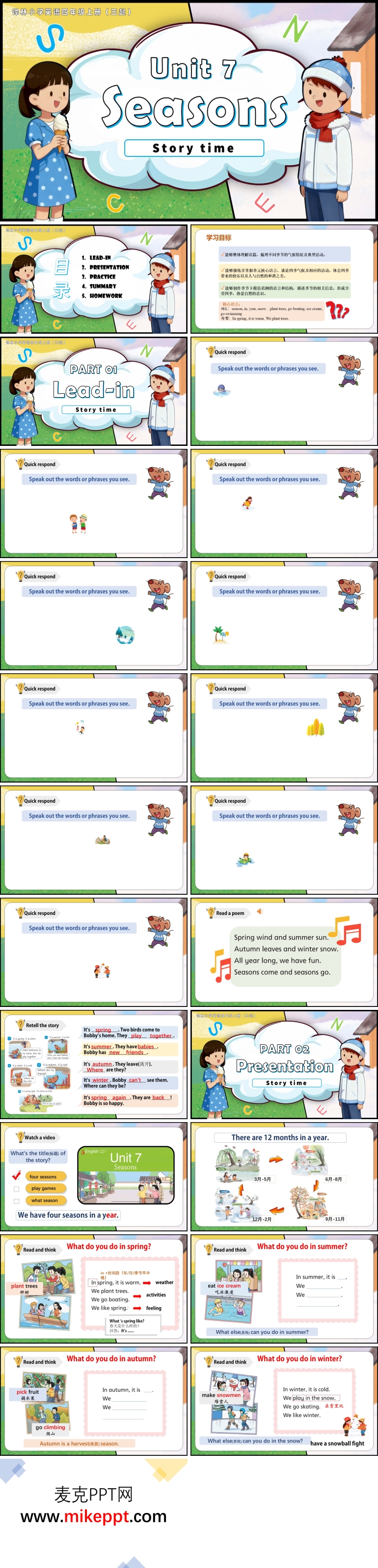 这是一套专为译林小学英语四年级上册(三起)Unit 7 第2课时“Story time”设计的PPT课件,通过PowerPoint制作,共包含34张幻灯片。本节课的核心目标是帮助学生整体理解语篇,梳理不同季节的气候特征及典型活动,并引导学生能够自主谈论四季气候及相关活动,从而提升学生的语言综合运用能力。 课件内容分为五个主要部分。第一部分是“Lead in”,通过“快速闪卡”游戏引导学生进入本节课的学习。在这一环节中,教师快速展示与季节相关的图片或单词卡片,学生需要迅速反应并用英语说出对应的词汇或短语。这种游戏化的导入方式不仅能够激发学生的学习兴趣,还能帮助他们快速回顾已学知识,为新课的学习做好铺垫。 第二部分是“Presentation”,主要引导学生学习不同季节所对应的月份,并学会用英文表达这些月份。例如,通过图片和表格的形式,展示春季包括March、April和May,夏季包括June、July和August等。此外,该部分还介绍了每个季节可以进行的典型活动。例如,在春季可以放风筝(fly kites),在夏季可以去游泳(go swimming),在秋季可以采摘水果(pick fruits),在冬季可以堆雪人(make snowmen)。通过生动的情境和丰富的例句,帮助学生理解季节与活动之间的关联,并掌握相关表达。 第三部分是“Practice”,通过设计与本节课内容相关的练习题,帮助学生巩固所学知识。练习题形式多样,包括选择题、填空题、匹配题和情景对话练习等。例如,设计一些填空题让学生用正确的月份或活动词汇完成句子,或者通过情景对话练习让学生模拟不同季节的活动场景进行交流。这些练习不仅能够帮助学生加深对知识的理解和记忆,还能培养他们的语言运用能力和合作精神。 第四部分是“Summary”,系统总结本节课的学习重点。通过回顾不同季节的月份、气候特征及典型活动,帮助学生构建完整的知识体系。例如,总结“Spring is warm and rainy. We can fly kites.”“Summer is hot and sunny. We can go swimming.”等表达,让学生清晰地了解本节课的重点内容,便于课后复习和记忆。 第五部分是“Homework”,布置与本节课内容相关的家庭作业。作业设计注重分层,包括基础题(如抄写月份和活动词汇)、拓展题(如用英语描述自己最喜欢的季节及活动)和挑战题(如创作一个小故事,讲述四季的变化及相应活动)。通过多样化的作业形式,满足不同层次学生的学习需求,同时鼓励学生在课后继续巩固和拓展所学知识。 整套课件设计科学合理,内容丰富实用,通过游戏导入、课文讲解、多样练习、系统总结和分层作业,全方位提升学生的学习效果。通过本节课的学习,学生不仅能够熟练掌握不同季节的月份及相关活动的表达,还能在实际生活中灵活运用英语描述四季变化及个人活动,真正实现学以致用。