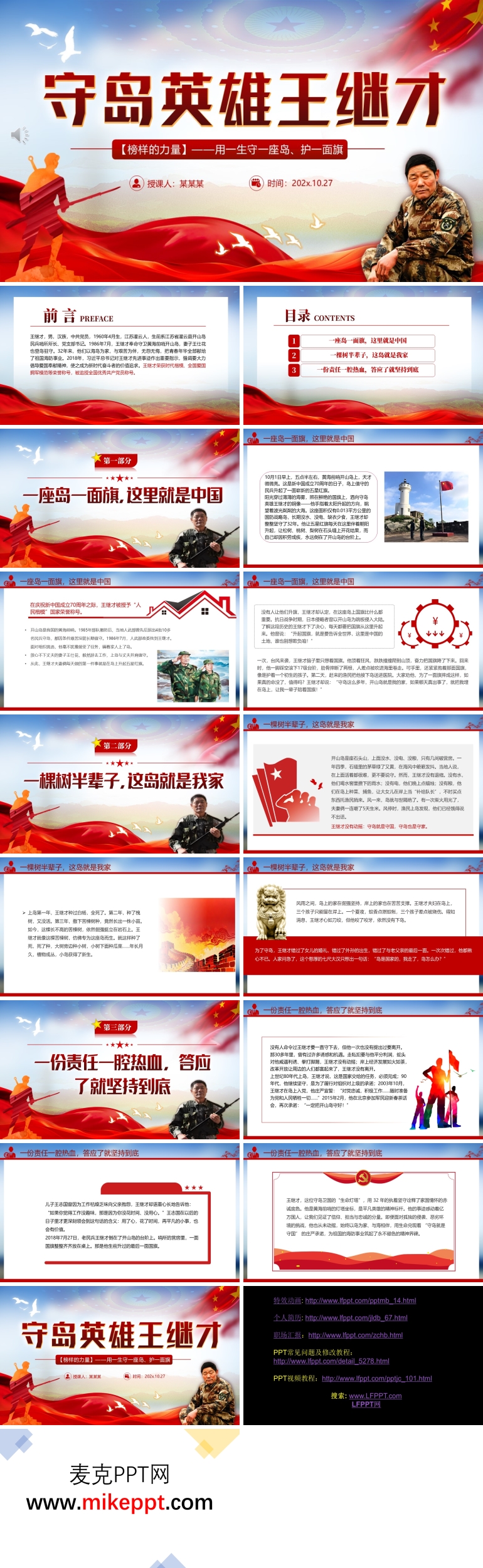 这套以"榜样的力量"为主题的党课课件,紧紧围绕"人民楷模"王继才的守岛事迹展开,通过十六幅精心编排的画面,将一位平凡共产党员的不平凡人生缓缓铺陈。课件开篇即以极具视觉冲击力的场景切入——金色晨曦穿透云层,将开山岛礁石上那面鲜艳的五星红旗与不远处的王继才铜像一同照亮,光影交织间,一个关于坚守与信仰的故事就此启幕。正是这位貌不惊人的民兵营长,在2019年新中国成立70周年之际,被习近平总书记亲自授予"人民楷模"国家荣誉称号,用最朴素的行动诠释了何谓"祖国在我心中"。 课件第二篇章以"一棵树半辈子,这岛就是我家"为题,用近乎白描的手法展现了王继才夫妇32年孤岛生涯的日常点滴。他们硬是在没水没电、寸草不生的花岗岩礁石岛上,挖坑填土、背水浇灌,让近200棵树苗在狂风中扎下根来,使昔日荒凉的"石头山"如今绿意盎然、生机勃发。每一株成活的海棠、每一簇茂盛的冬青,都是他们夫妻以心血喂养的生命奇迹,更是"家国之爱"在孤岛上的具象化呈现——岛再小,也是祖国的领土;家再简,也承载着赤子深情。 第三篇章则直抵精神内核,以"一份责任,一腔热血,答应了就坚持到底"为主线,选取了多个震撼人心的细节:他每天升旗巡岛、写就189本日志,在漆黑风夜冒着生命危险抢修灯塔,甚至母亲去世、孩子降生都未能离岛一步。这些看似琐碎却重若千钧的坚守,最终淬炼成"守岛就是守国,国安才能家宁"的铮铮誓言。课件最终落脚于新时代共产党人的责任担当,引导党员深刻领悟:真正的榜样不在远方,就在那份"一句承诺、一生践行"的纯粹初心之中。