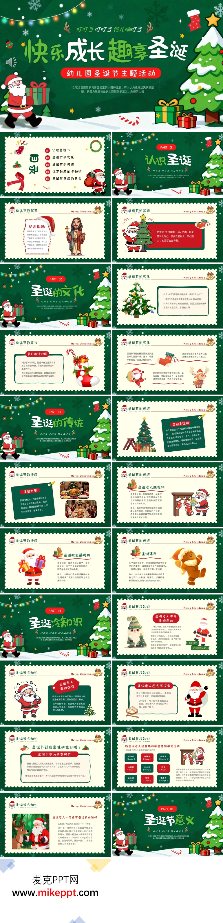 这套专为幼儿精心打造的圣诞节主题活动课件,以二十六张趣味盎然的幻灯片为载体,引领孩子们踏上一场充满温暖与惊喜的文化探索之旅。开篇"认识圣诞节"环节,巧妙地通过耶稣诞生的故事,不仅为孩子们揭开节日起源的神秘面纱,更在他们幼小的心田播撒下"爱人如己、关怀奉献"的善良种子,让品德教育自然融入节日认知之中。 继而深入"圣诞的文化"篇章,课件化身时光机,带领孩子们穿越至19世纪中叶,目睹这一西方佳节如何远渡重洋,在日本、韩国等亚洲国家落地生根,最终演化成今日我们熟知的模样。通过鲜活的画面与生动的解说,孩子们将理解到,无论是互赠心意满满的礼物,还是阖家共享圣诞欢宴,亦或是圣诞老人与璀璨圣诞树营造的梦幻氛围,都是不同文化交融共生的美好见证。 "圣诞的传统"部分则将镜头拉回节日现场,让孩子们近距离感受浓浓的节庆气息:亲手装饰挂满彩球的圣诞树,围坐品尝香喷喷的圣诞大餐,睡前满怀期待地挂上圣诞袜等待惊喜,还有热闹非凡的圣诞集市。这些具象化的场景描绘,让遥远的风俗变得触手可及,激发孩子们的参与热情与想象力。 随后的"圣诞冷知识"环节,如同开启一扇趣味之窗,用一个个意想不到的小秘密——比如圣诞老人的驯鹿名字、姜饼屋的由来等——满足孩子们旺盛的好奇心,在欢声笑语中拓宽知识视野。 最终落脚于"圣诞节的意义",课件升华主题,引导孩子们领悟:这个节日最美之处,不在于收到多少礼物,而在于学会无私分享的快乐,懂得对爱与关怀心怀感恩,并愿意将这份温暖传递给更多人。通过这番循循善诱,帮助幼儿建立起"给予比接受更幸福"的价值观,让节日的教育意义真正入脑入心。