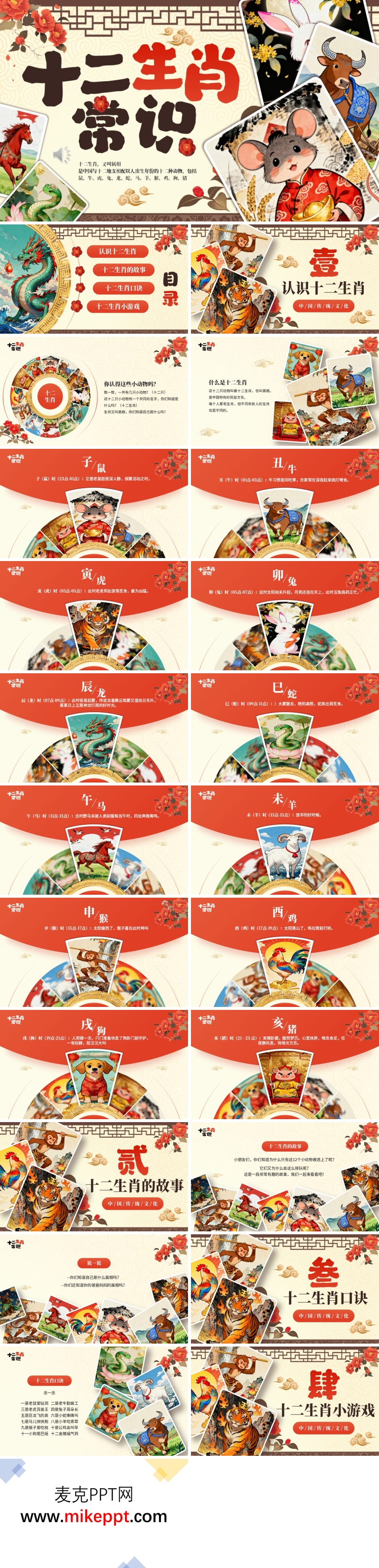 这套以"十二生肖"为主题的民俗文化启蒙课件,通过精心编制的二十七张幻灯片,为孩子们搭建起一座连接传统与现代、神话与生活的趣味桥梁。十二生肖,这一又称"属相"的古老纪年符号,是中华民族独创的文化基因,每个人自呱呱坠地那年起,便被赋予其中一种动物形象作为终身文化标识,它不仅是年龄的标记,更是承载着千年智慧的精神图腾。关于它的起源,流传着一个充满想象力的神话传说——远古时代,玉皇大帝为了让凡间百姓能清晰地记录岁月流转,特地在天河之畔举办了一场盛况空前的"生肖选拔赛",号令一出,百兽竞逐,从机智的老鼠到勤恳的牛,从威武的虎到温顺的兔……经过层层考验,最终十二种动物凭借各自特质荣登仙榜,成为守护时间的生肖神祇,从此演绎出"鼠咬天开、牛耕春晓"的美丽序章。 这份演示文稿匠心独运地设计了四大教学模块,环环相扣,由浅入深。第一部分"认识生肖"采用高清萌趣的动物形象与汉字演变动画,引导孩子们逐一认识十二位"时间守护者",在视听结合中完成初步记忆。第二部分"故事讲述"则化身说书人,用情景再现的方式生动演绎那场跨越激流、翻越高山的选拔赛,并巧妙设置互动环节,鼓励孩子们踊跃说出"我属鼠,爸爸属龙,妈妈属兔",将遥远的神话与温暖的亲情紧密相连。第三部分"口诀展示"提炼出"子鼠丑牛寅虎卯兔,辰龙巳蛇午马未羊"等节奏明快的记忆口诀,配合拍手歌、韵律操等形式,化枯燥背诵为快乐吟唱。第四部分"生肖游戏"更是点睛之笔,设计"动物排队""生肖迷宫""属相拼图"等互动闯关环节,让孩子们在拖拽点击的游戏化体验中,自然而然地内化顺序规律。整套课件通过故事化导入、生活化联结、口诀化记忆、游戏化巩固的完整闭环,让生肖文化不再是书本上的铅字,而是可触可感、可亲可爱的童年伙伴,在欢声笑语中完成文化基因的传承启蒙。