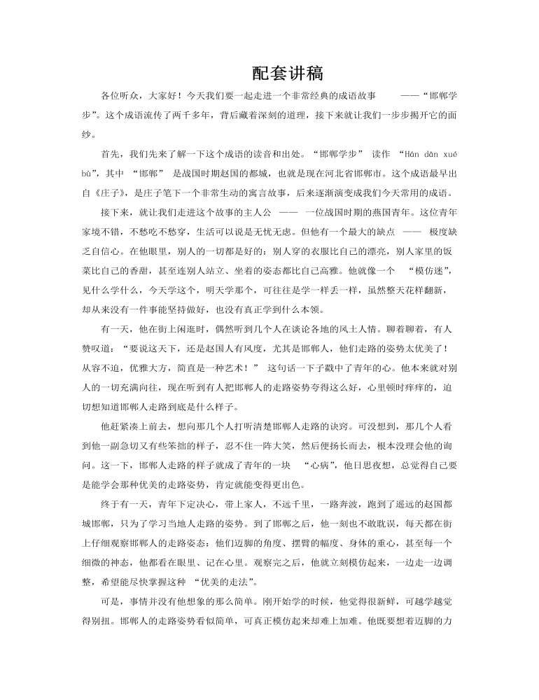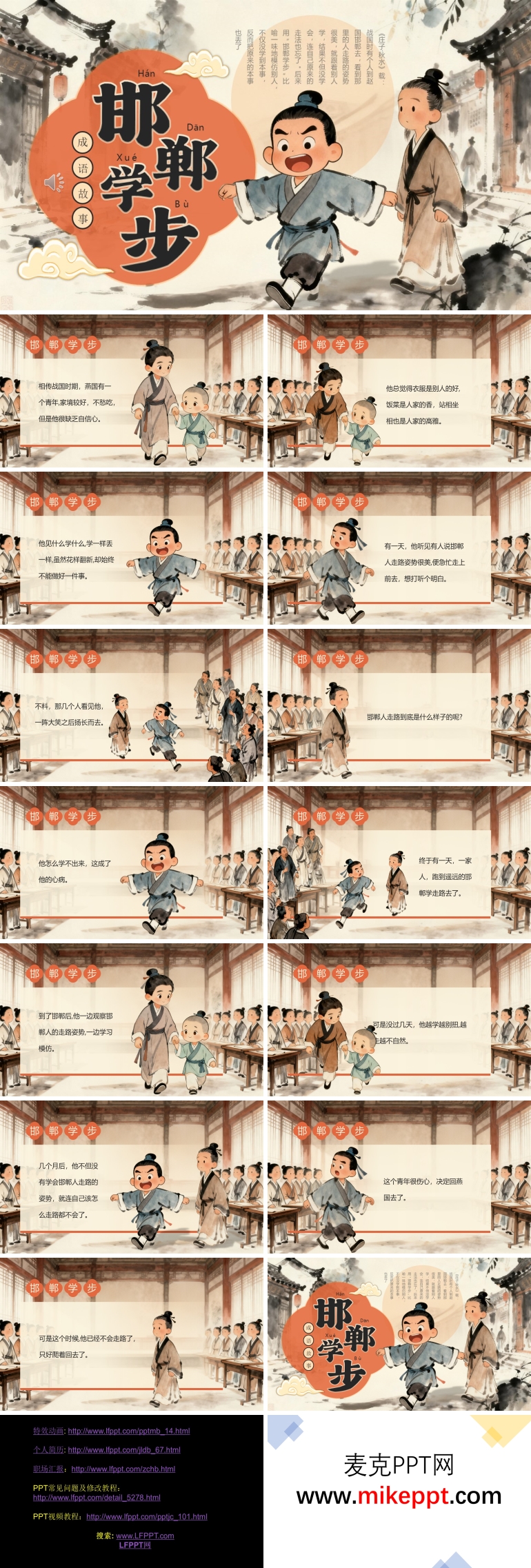 这套以"邯郸学步"为主题的成语故事课件,通过十五帧精心设计的画面,将一则流传千载的警示寓言娓娓道来。故事始于一位燕国青年对邯郸城的热切向往——这座战国名都不仅以冶铁业闻名天下,更因赵人步履间的从容优雅而备受推崇。青年慕其名远道而来,本欲求学精进,却陷入了对表面形式的盲目迷恋。他整日徘徊街头,目不转睛地观察邯郸人举手投足间的韵律:那看似随意的摆臂、若不经意的迈步、衣袂飘飘的转身,在他眼中都成了值得拆解模仿的"高深学问"。 课件第二部分生动刻画了邯郸人对这位异乡客的反应。初时,人们只当他是好奇的游子,报以善意的微笑;然而当他开始亦步亦趋、刻意复制每个路人的姿态时,愕然与不解便浮现在众人眼中。燕国青年的失常举止,实则是舍本逐末的心理投射——他误以为优雅的气质可以剥离内涵而单独习得,却不知邯郸人步履中的风采,源自数百年文化底蕴与生活从容的积淀。 第三部分展现故事的高潮与转折。青年废寝忘食地练习,时而模仿老者佝偻缓行,时而效法少年跳跃奔逐,甚至试图复刻妇人的婀娜莲步。他含枚练步、绑石坠身,种种怪诞方法用尽,非但未得其精髓,反而连原本自然行走的本能都丧失殆尽,最终只能狼狈爬行返乡,沦为千古笑柄。 课件最终落脚于深邃的哲理启示:学习他人长处本无可厚非,但若失去自我根基,便如沙上建塔,终将一无所获。我们应在博采众长的同时,清醒认知自身特质,将借鉴与创造结合,让传统文化在创新中重生。唯有如此,方能避免重蹈那位燕国青年的覆辙,真正实现个人的成长与文化的传承。
