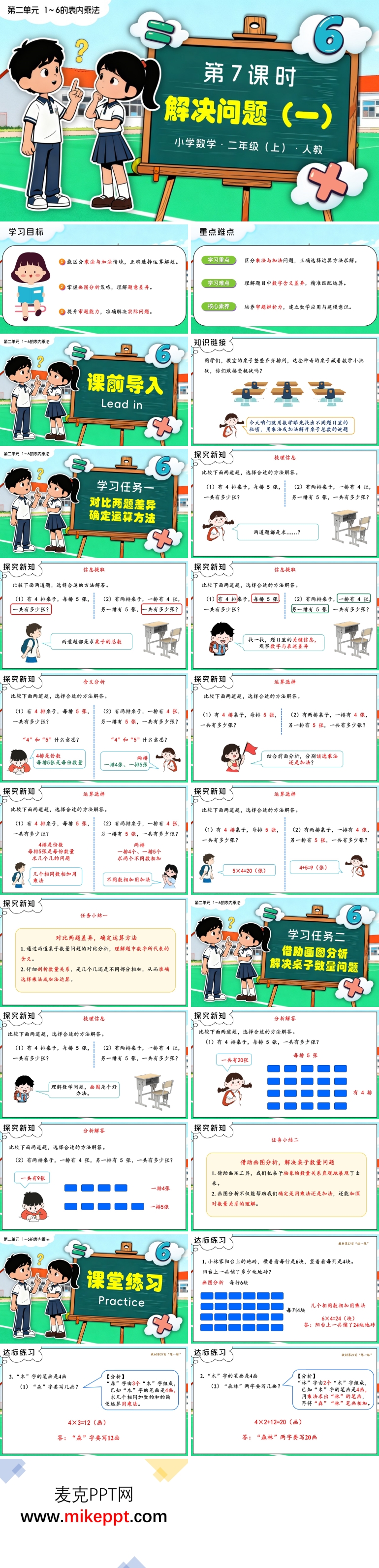 本套PPT课件是围绕人教版数学二年级上册第二单元第7课时“解决问题(一)”精心设计的,包含25张幻灯片。课程的核心目标是通过具体情境引导学生精准识别“求几个相同加数的和”这一类数学问题,并熟练掌握其解题方法。同时,通过本节课的学习,让学生完整经历“审题—分析数量关系—列式解答—检验”的解题过程,从而培养学生的逻辑思维能力和问题解决能力。 PPT课件的内容主要从两个方面展开。第一部分是对比两题差异,确定运算方法。这一部分通过引导学生仔细阅读和分析题目,培养他们提取关键数学信息的能力,明确题目所求。通过对比两题的异同,学生能够初步感知题目间的差异,为后续的正确解答奠定基础。第二部分是借助画图分析,解决桌子数量问题。这一部分通过画图的方式,让学生更加直观地感受两题的本质区别,从而强化对题意的理解。通过画图,学生可以清晰地看到问题的结构和关系,进一步提升对“求几个相同加数的和”问题的理解和解决能力。 整体而言,这套PPT课件通过对比分析和直观画图两种方式,帮助学生逐步深入理解数学问题的本质,掌握解题方法,提升数学思维能力。