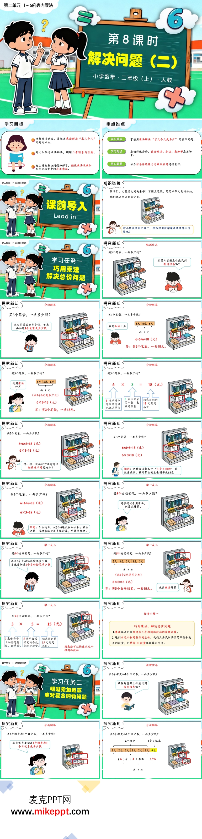 本套PPT课件是针对人教版数学二年级上册第二单元第8课时“解决问题(二)”而设计的,包含34张幻灯片。课程的主要目标是帮助学生初步理解“倍”的概念,并能够结合具体情境准确识别“求一个数的几倍是多少”的数学问题。通过本节课的学习,学生将在动手操作和小组合作的过程中,逐步培养抽象概括能力和逻辑思维能力。 PPT课件从两个方面展开本节课程的学习。第一部分是“巧用乘法,解决总价问题”。在这一部分,通过具体的购物情境,引导学生提取关键的数学信息,并根据问题选择合适的条件。通过实际操作和情境模拟,学生能够直观地感受到乘法在解决实际问题中的应用,从而更好地理解乘法的意义和作用。这一环节不仅帮助学生掌握乘法的基本运算,还培养了他们从实际问题中提取数学信息的能力。 第二部分是“明晰乘加运算,应对复合购物问题”。这一部分主要让学生自主探究解题方法,通过对比加法和乘法的联系,进一步理解乘法的意义。在解决复合购物问题时,学生需要综合运用加法和乘法,通过对比两种方法的异同,进一步巩固乘法的应用。这一环节不仅提升了学生的数学应用意识,还激发了他们的创新思维,使学生能够灵活运用所学知识解决复杂的实际问题。 通过这两个部分的学习,学生不仅能够掌握“倍”的概念和乘法的应用,还能在实际操作和小组合作中培养数学思维和解决问题的能力。整套PPT课件通过生动的情境和丰富的互动环节,帮助学生更好地理解和应用数学知识,为后续的学习打下坚实的基础。