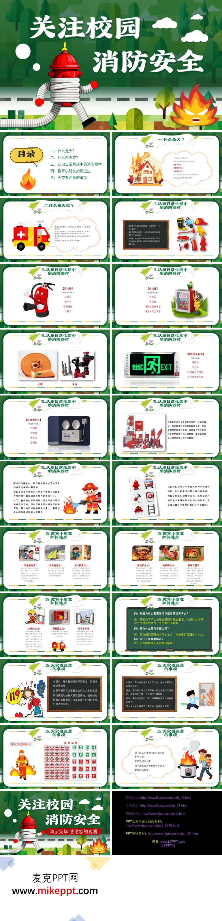 这是一套专为校园消防安全教育量身定制的主题班会PPT课件,共22张幻灯片,以"认识火、预防火、远离火"为主线,从五个维度构建起系统化的消防安全知识体系。 第一部分"火的双面性",采用启发式提问切入,引导学生结合生活经验思考"火在何时是我们的朋友"——烹饪、取暖、发电等场景,让学生认识到火既是文明进步的象征,也潜藏危险,从而自然引出学习主题。 第二部分"火灾的成因与警示",深入剖析火灾发生的三大要素(可燃物、助燃物、火源),通过触目惊心的真实案例与数据,直观展现火灾的破坏力,让学生深刻理解"星星之火,可以燎原"的严峻性,筑牢心理防线。 第三部分"消防器材大揭秘",运用图文结合、动画演示等多元形式,逐一详解灭火器(种类、压力表识别、使用口诀"提、拔、握、压")、消火栓(结构、开启方式)、疏散指示标志(识别与遵循)、应急照明灯(作用)等关键设施,让学生看得懂、记得住、敢操作。 第四部分"火场逃生三十六计",作为核心环节,通过情景模拟图与步骤分解,传授"黄金90秒"逃生法则:保持低姿匍匐前进、湿毛巾折叠八层捂住口鼻、沿墙摸黑有序撤离、绝不贪恋财物、绝不乘坐电梯等实用技能,并强调"报警、自救、互救"的优先级。 第五部分"火灾应急铁律",总结关键时刻的"救命清单":第一时间拨打119,冷静说清"地址、火势、人员"三要素;火势失控时果断放弃灭火,优先确保自身安全;牢记"小火快逃、浓烟关门"的基本原则,将生命至上理念根植于心。 整套课件寓教于乐、干货满满,既有理论深度,又具实操价值,是提升学生消防安全素养的优质教学资源。