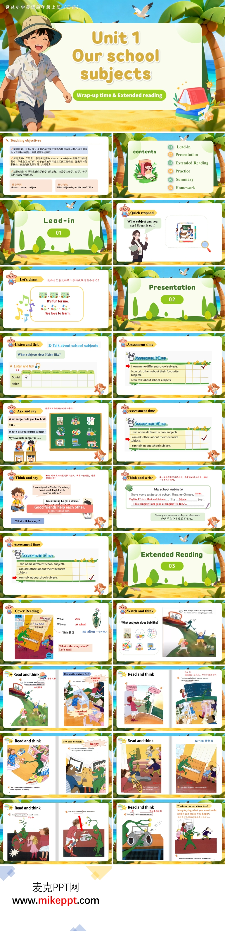 这套共34张幻灯片的演示文稿,专为译林版四年级上册Unit 1第3课时“Wrap-up time & Extended reading”量身打造,以“温故知新、读写融合、品格升华”为主线,引领学生在轻松而充实的节奏中完成单元收官。课堂伊始,教师用“Shake it! 字母摇摇乐”热身:屏幕上的彩色字母袋随机停格,学生需快速拼出“ruler, rubber, pencil”等本单元词汇并做相应动作,既激活旧知,又瞬间点燃全场。随后,教师借助一首朗朗上口的“Clean Up Rap”英文诗歌,把“Put your book on the shelf.”“Keep your desk nice and clean.”等句型融入节奏,学生边拍手边吟诵,在音乐的律动中自然复习重点表达。进入知识呈现环节,课件先播放一段20秒的“教室小混乱”录音,学生边听边勾选听到的物品,训练抓关键词的听力策略;接着开展“Pair & Share”——两人一组用“Where is my…?”“It’s in/on/under…”互问互答,教师随机拍照上传大屏,用“点赞”动画即时评价,增强互动感;最后创设“Miss Li 的整洁课桌”情境,引导学生用3句话写一写“How to keep our classroom clean”,为后续阅读埋下写作伏笔。拓展阅读部分,文稿呈现一篇题为《Tidy Tom》的80词小短文,教师先示范“略读”——30秒扫读抓主旨,再指导“寻读”——用荧光笔定位“sweep, wipe, put back”等动词,学生分组完成“阅读寻宝卡”,每找对一个词即可为小组赢得“Clean-up徽章”,在竞赛中提升阅读速度与精准度。练习巩固环节包含“图文匹配—判断正误—选词填空”三级任务,均围绕“爱护教室物品”主题设计,题型丰富且层层递进,帮助学生把语言知识内化为行为能力。知识小结时,学生齐做“Tidy Hands”手势操,边做边齐背“Keep it clean, make it nice; Our classroom is our pride!”的课堂口号,情感目标随之水到渠成。作业设计体现梯度与创意:基础层——跟读《Tidy Tom》录音并上传;提升层——拍摄一张“我最整洁的课桌”照片,用两句英文配图说明;拓展层——小组合作制作“Classroom Care”英文海报,下节课开展“最美教室”评选。整套PPT画面清新、节奏明快,既系统梳理了单元知识,又培养了阅读策略与劳动责任感,让四年级孩子在英语课堂上收获语言、能力与品格的多重成长。